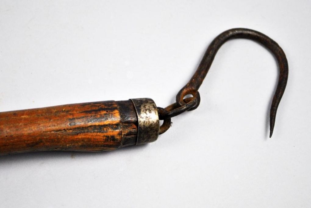 Dansk 1700-tals bismervægt i egetræ. Træstang udstyret med en jernkrog i den ene ende og en drejet klods i den anden med jernring. På stangen messingsøm som måleenheder. L.: 87 cm.