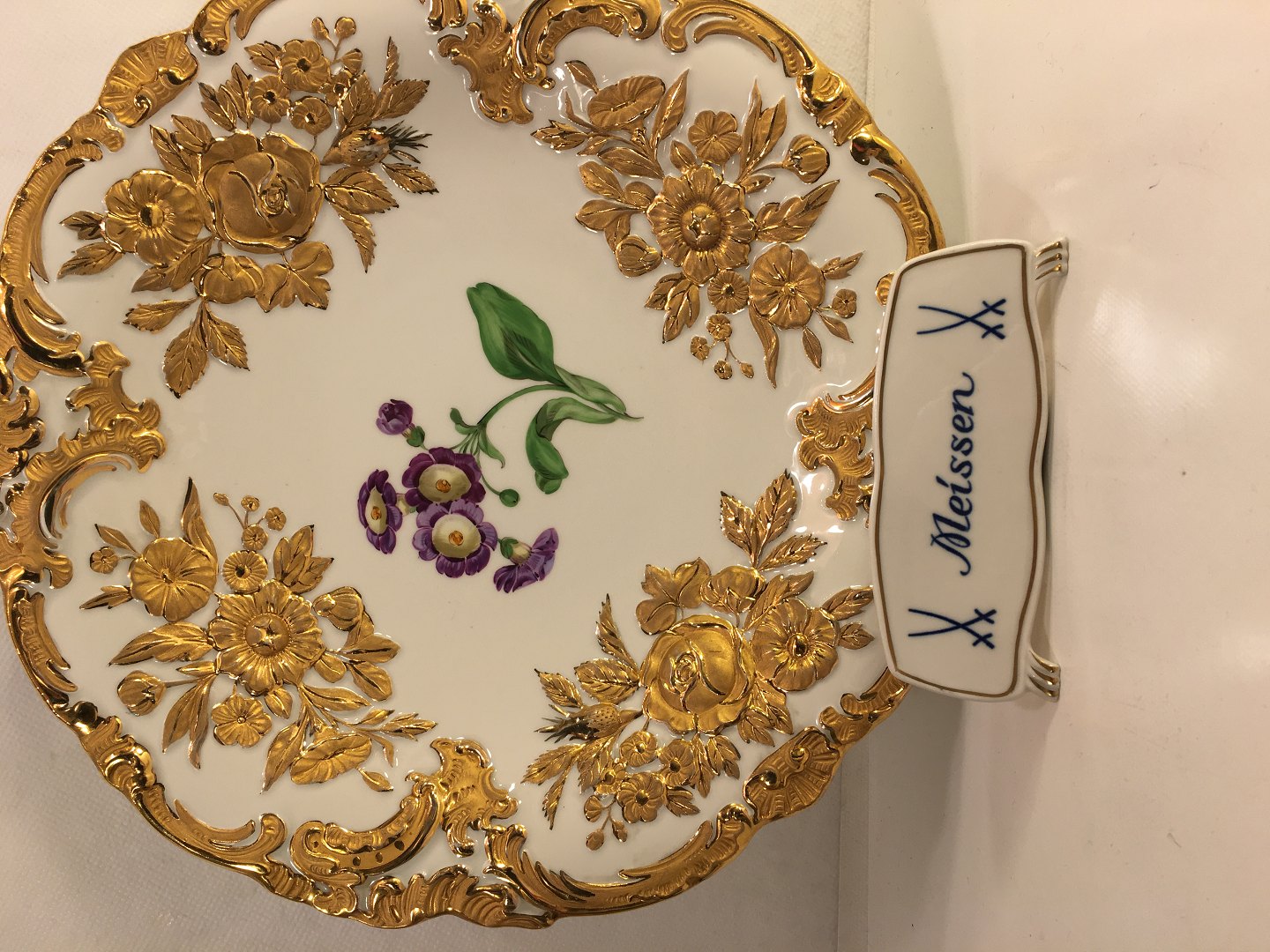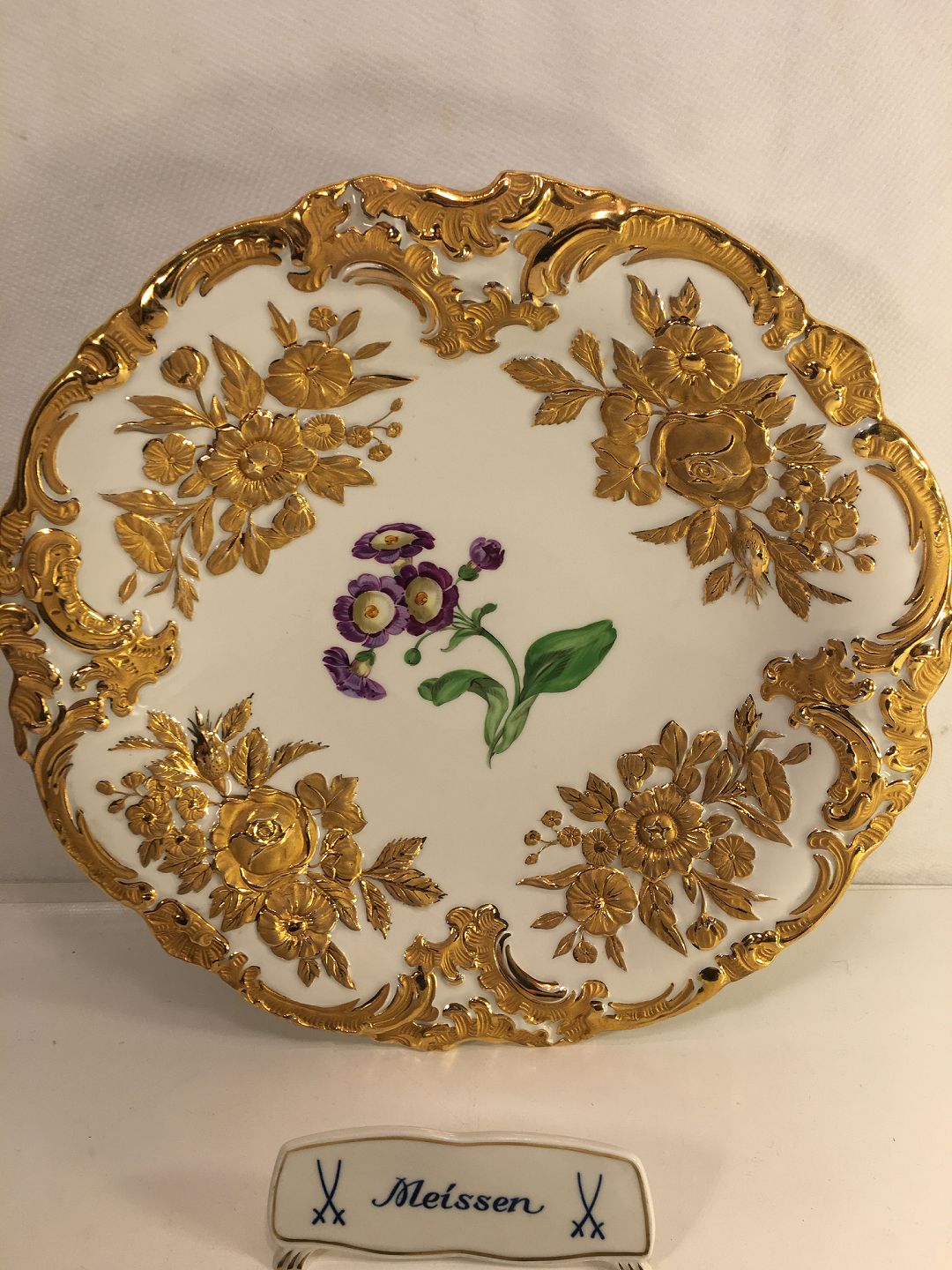 med Forgyldt dekoration i form af Blomster og bemalet blomst midt i faddet.