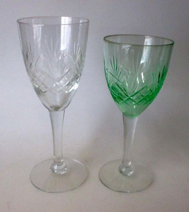 Else glass service, Kastrup Glassworks, 20th century Denmark. Red wine - clear, height 16.5 cm. Price per piece: 200,- kr. White wine with green bowl, height: 15 cm. Price per piece. 200,- kr. Port wine. Height: 13.5 cm. Price per piece: 100,- kr. Snaps: Height: 10 cm. Price per piece. 75,- kr. Soda glass. Height: 11.5 cm. Price per piece: 100,- kr.