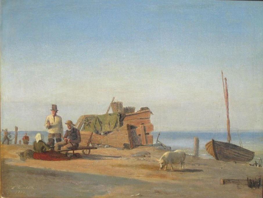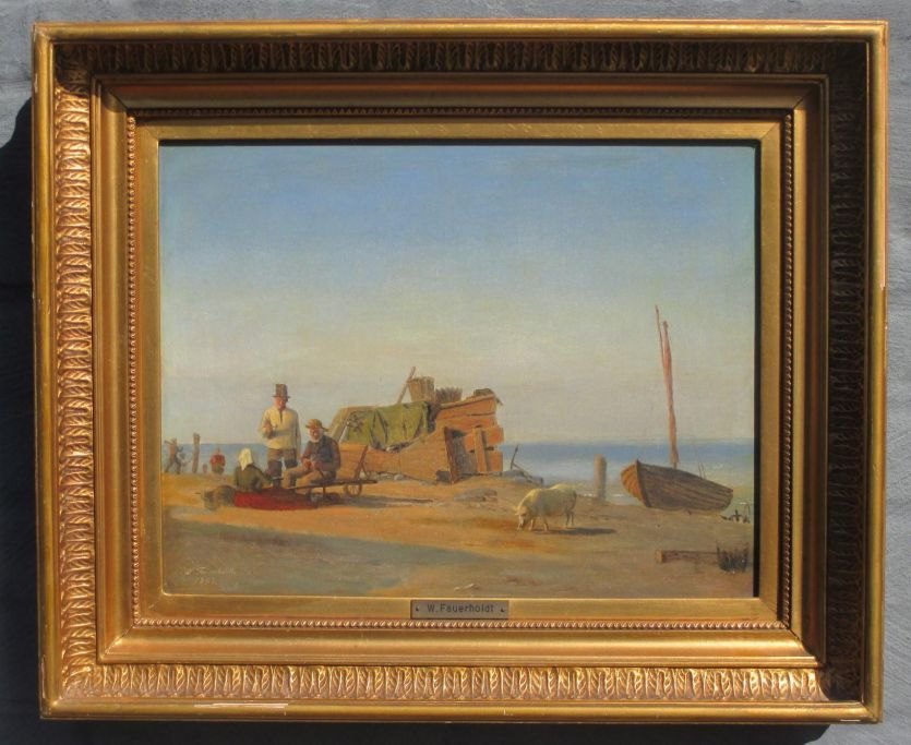 Fauerholdt, Viggo (1832 - 1883) Danmark: Strandparti ved Taarbæk. Olie på lærred/opklæbet på plade. Signeret.: W. Fauerholt 1857.