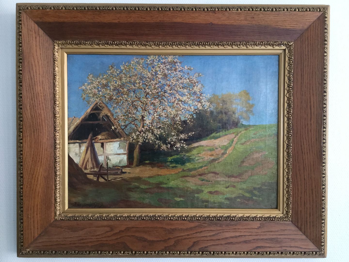 Maleri Edmund Petersen - Gammel faldefærdig gård med blomstrende frugttræ 1919.