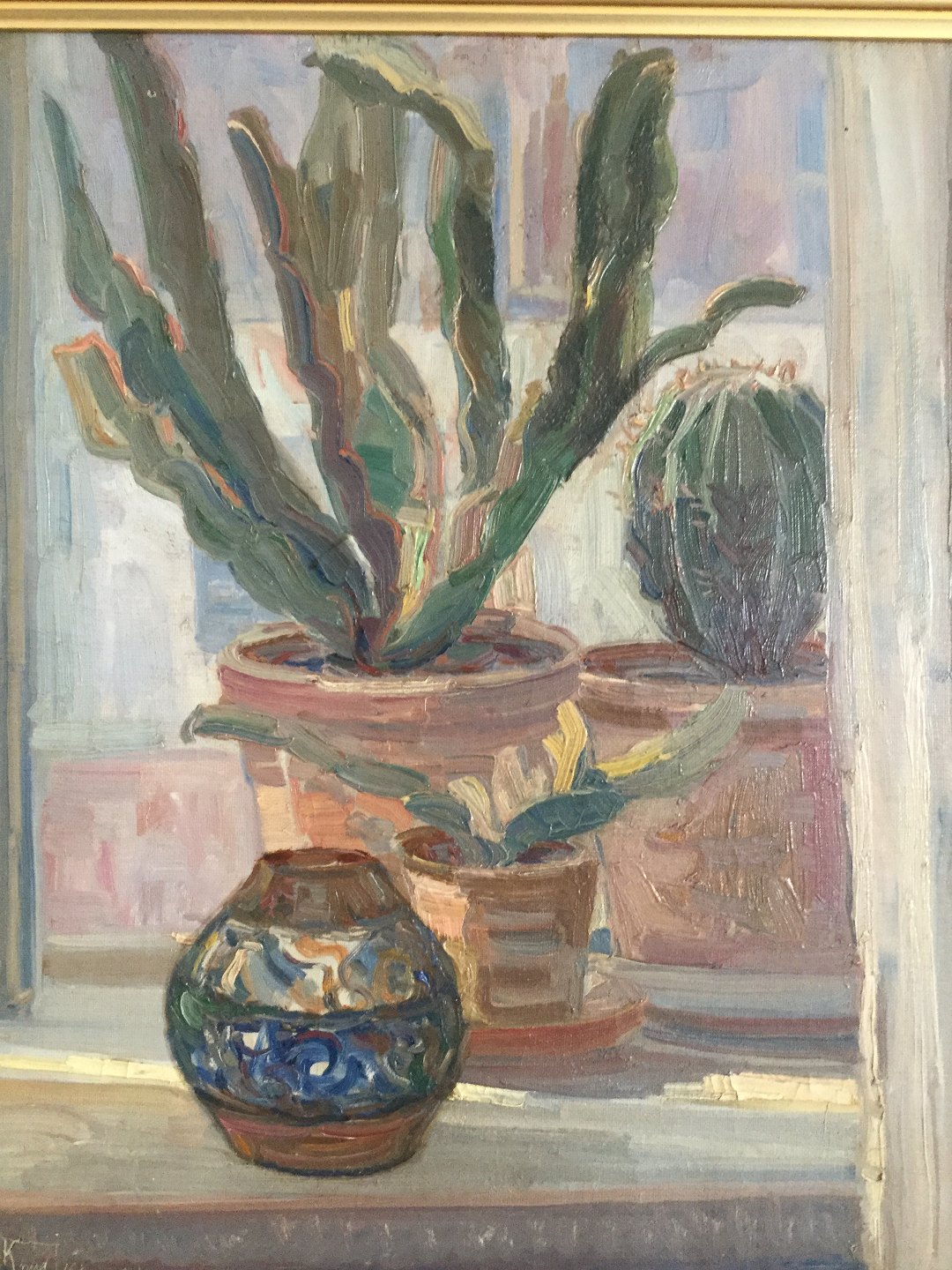 Opstilling i vindueskarm med vase og kaktusser 1916.