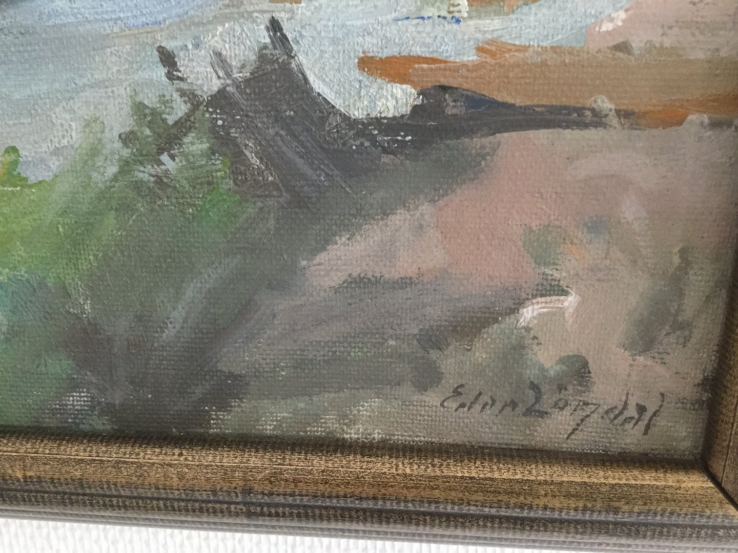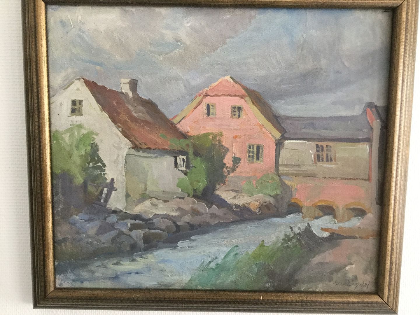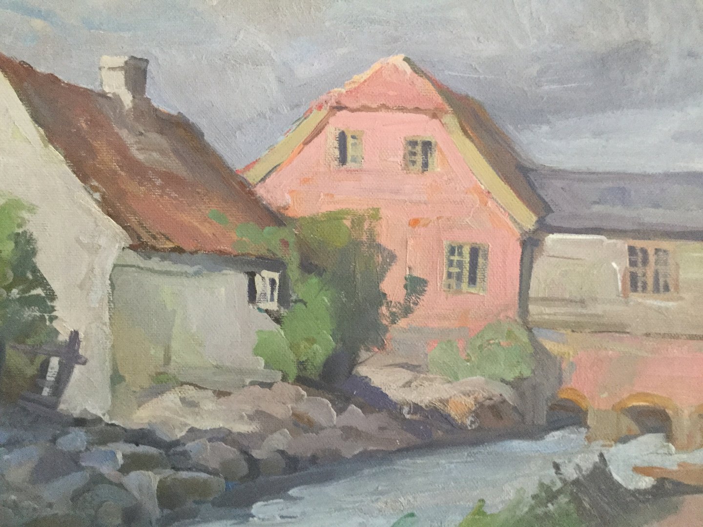 Maleri af Eiler Løndal - Huse ved å med bro.