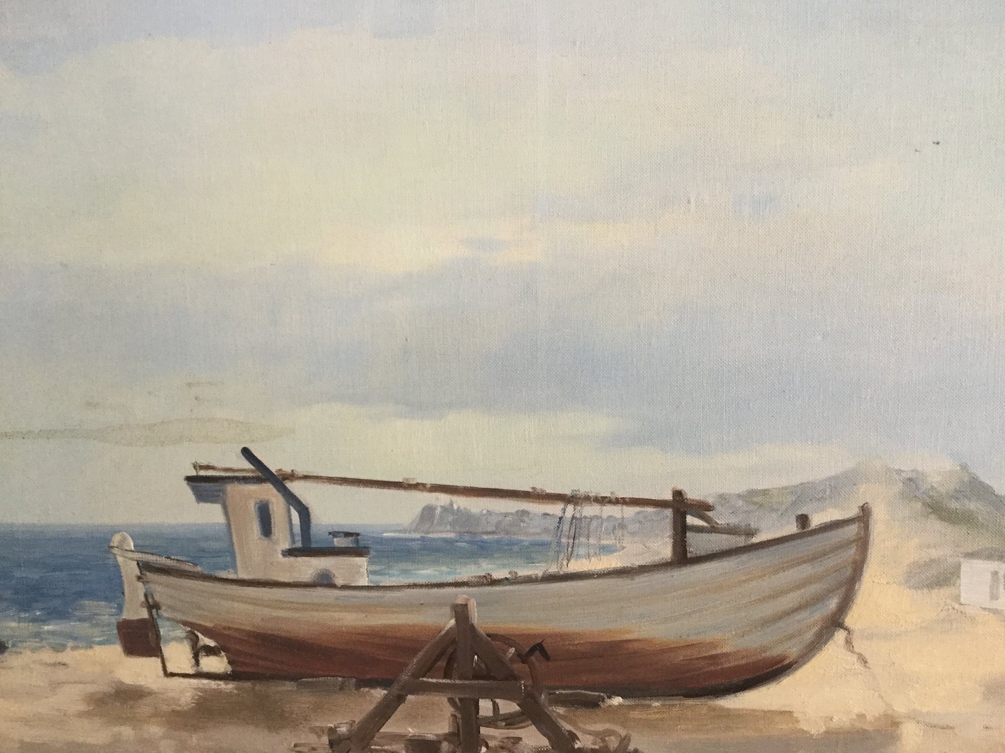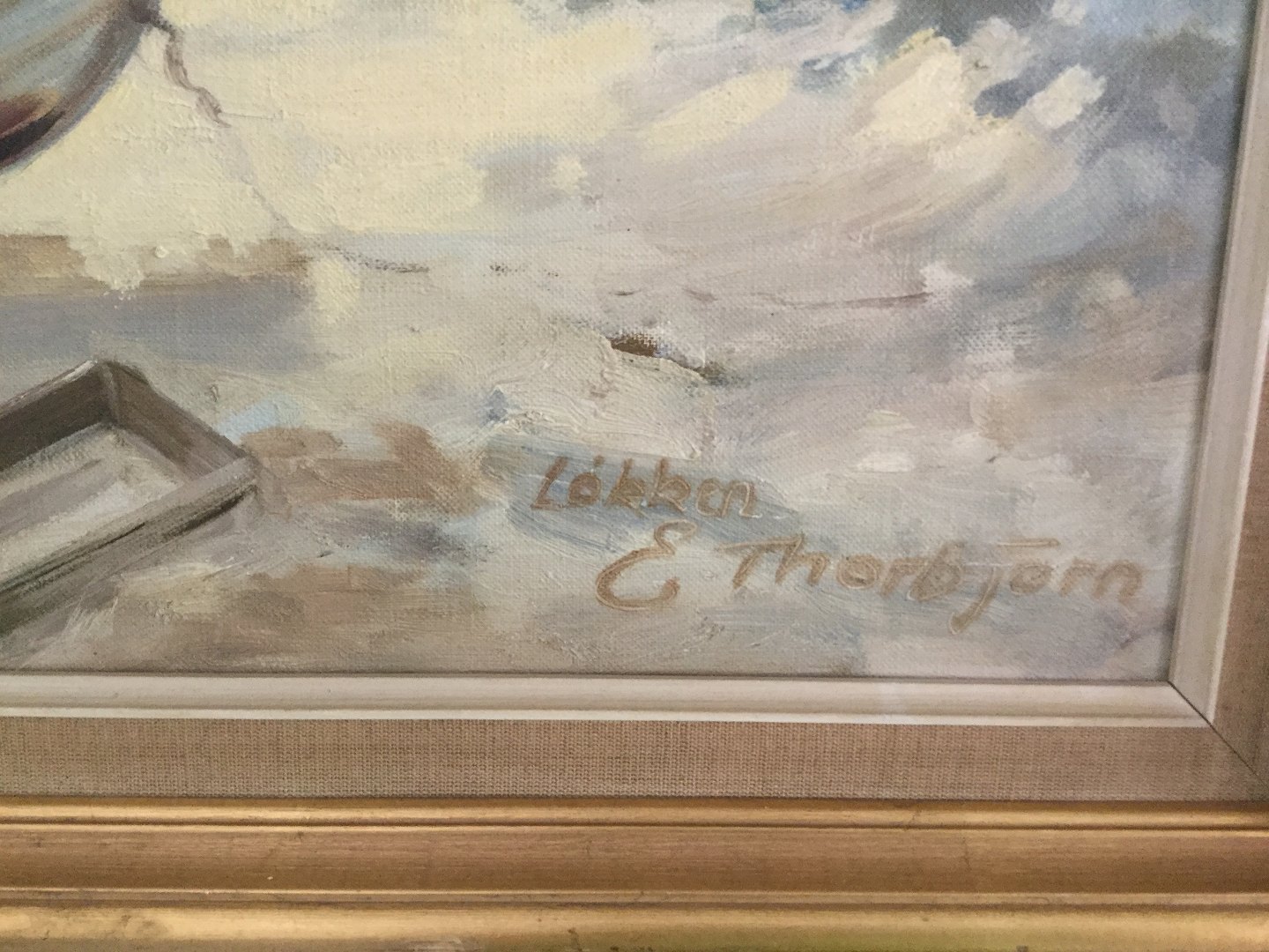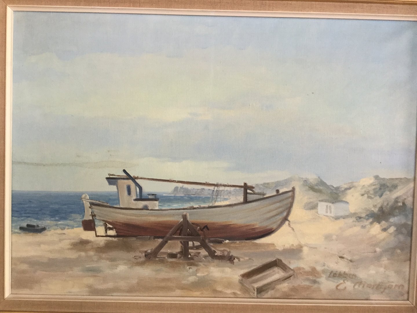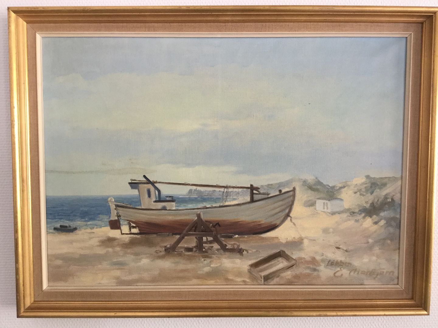 Maleri af E. Thorbjørn - Strandparti fra Løkken med optrukne fiskerbåde.