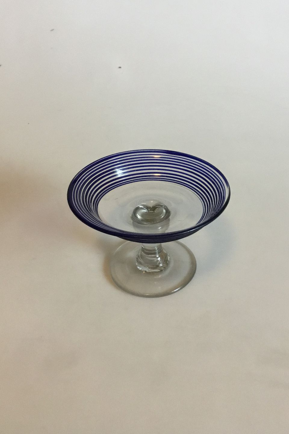 Holmegaard Sugar Bowl/Tray/Plate on reverse balustrade style, flat-woven bum with blue border and blue thread spiral. Approx. 1865. Measures 11.5 cm / 4 17/32 in. dia. x 7.3 cm / 2 7/8 in. high.
