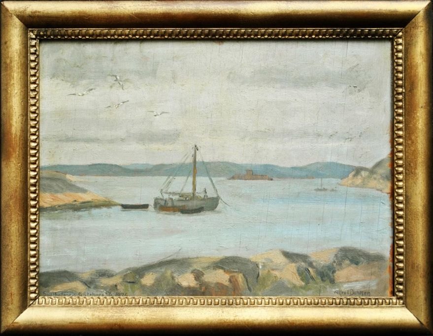 Dahlsen, Alfred (1887 - 1962) Denmark. The entrance to Gothenburg. Saltholmen. Signed: Alfred Dahlsen 10.6.1926. Oil on wood. 25 x 33 cm.