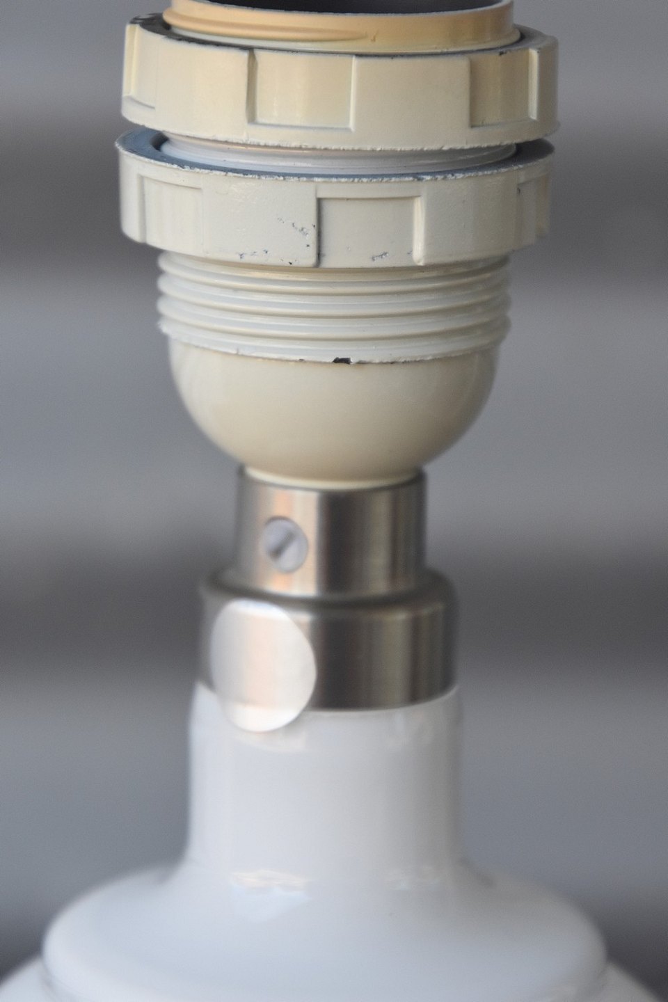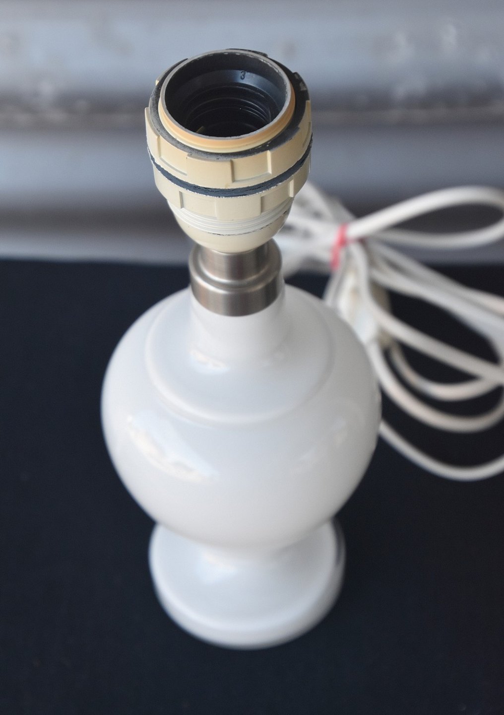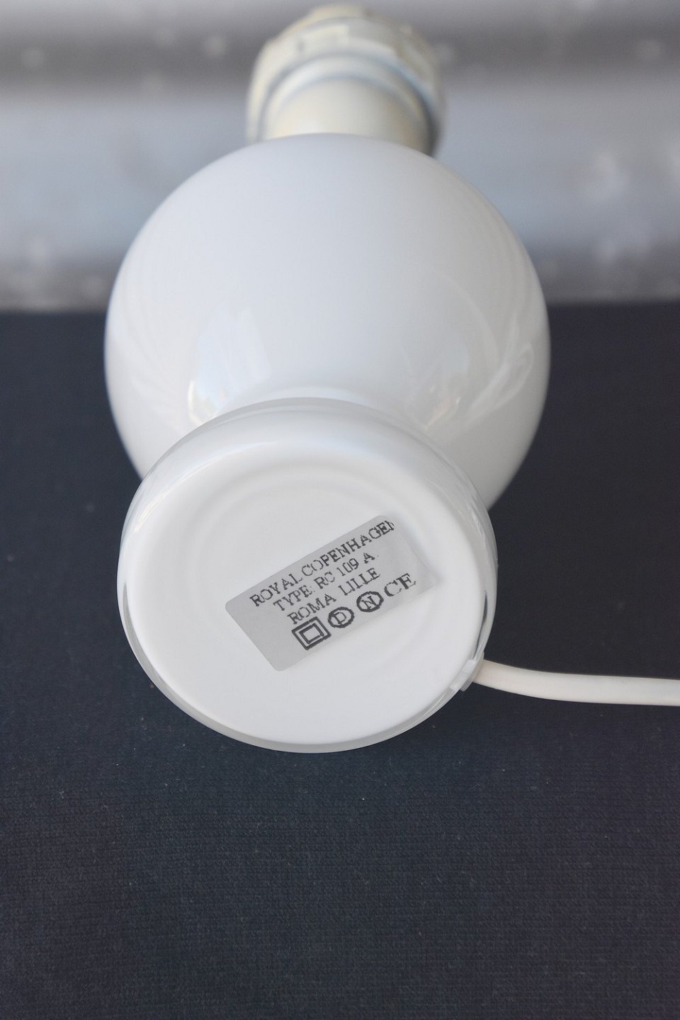 Holmegaard bordlampe "Roma, lille" i hvidt opalglas, med stål fatning.