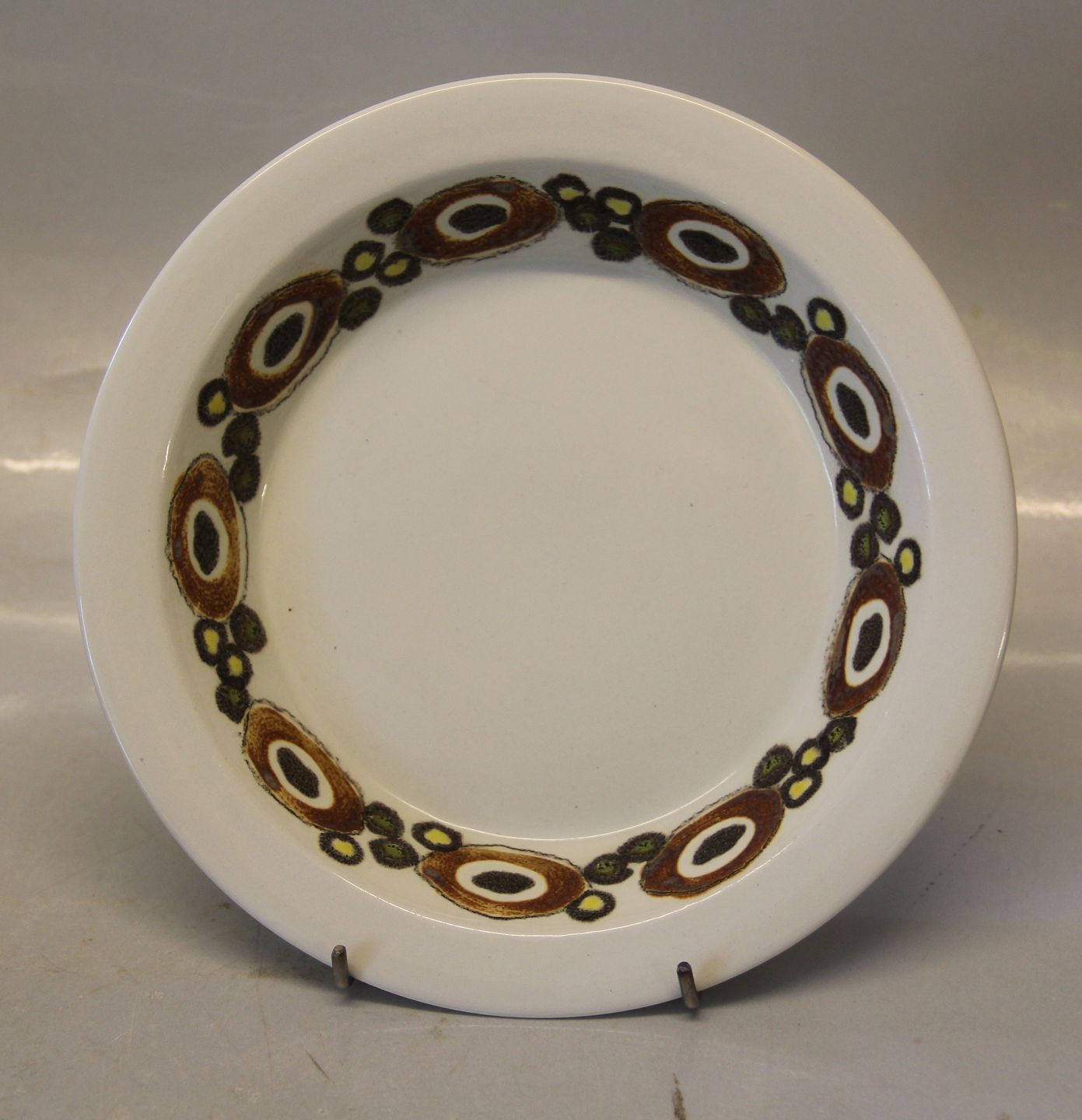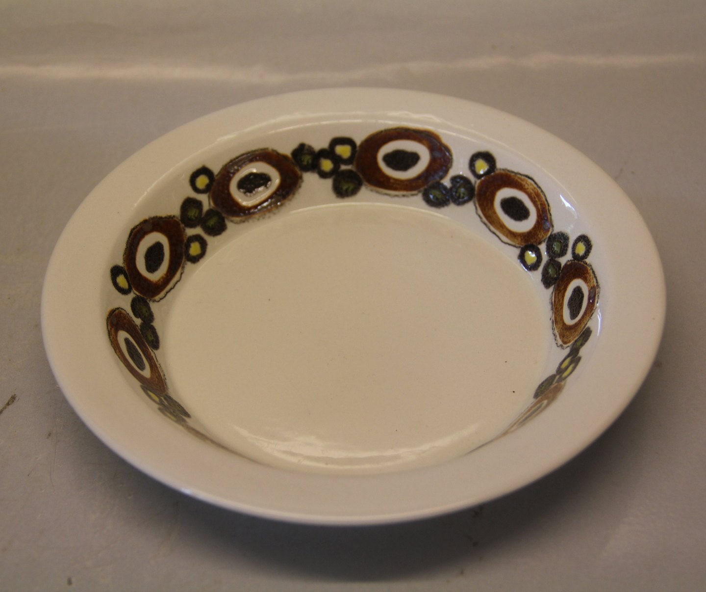 3464 Lille dyb tallerken 18,8 cm, brun Nucella Aluminia Fajance Nucella Stelform 1589 V.T.N af Inge-Lise Kofoed og Leif Lautrup-Larsen. 1966 Dekoration: Nucella af Ellen Malmer - blå eller brungule farver - fra 1969 Baca dekoration Royal Copenhagen Fajance