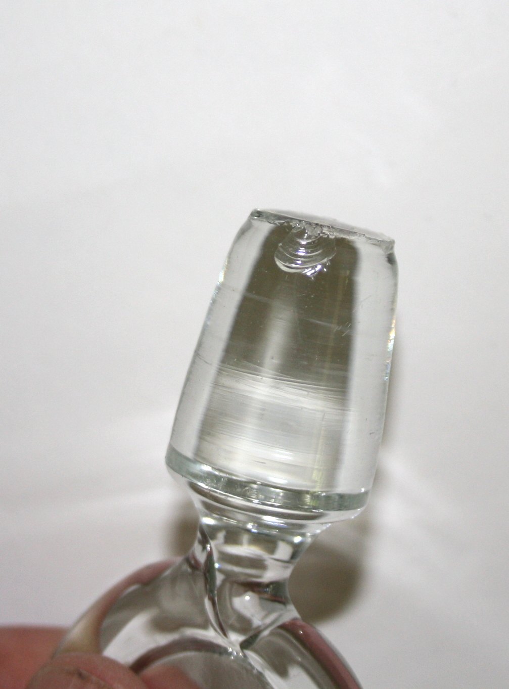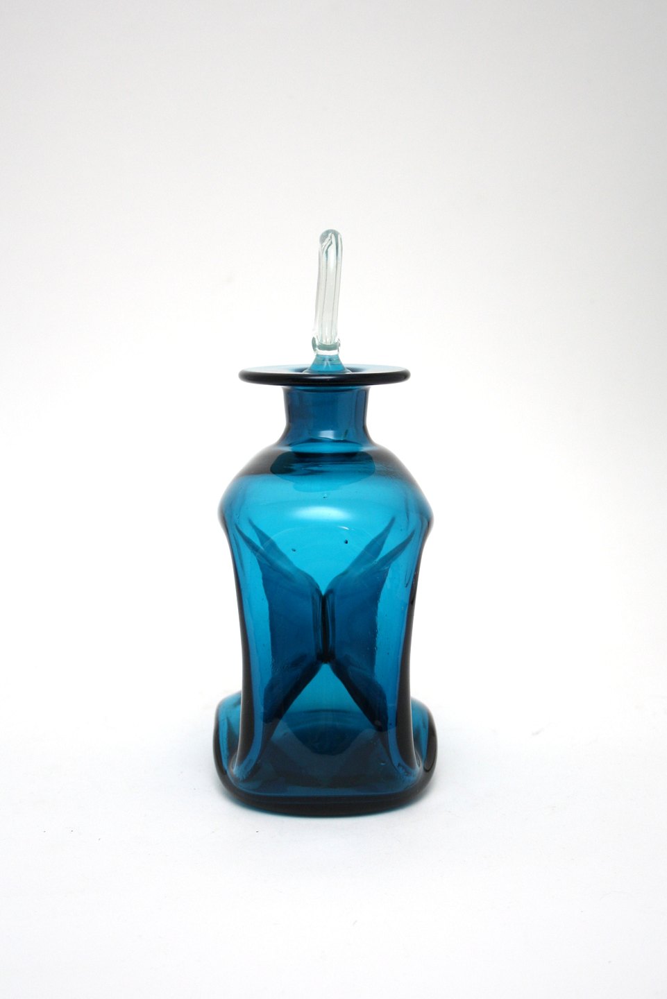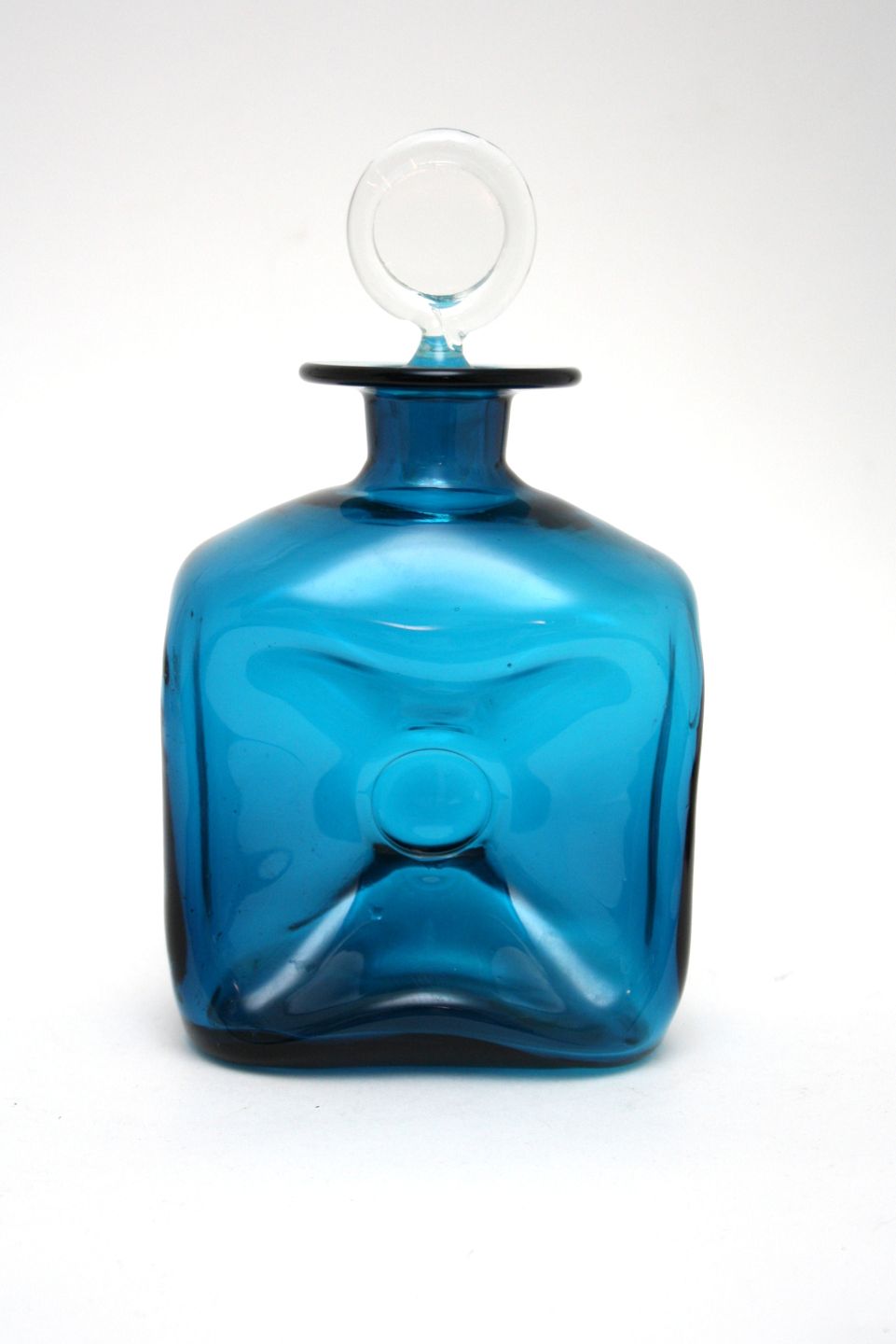 Kastrup Glasværk 1963. Firkantet karaffel i blåt glas med afrundet skulder, og sammenklemt som en klukflaske. Prop i sammenklemt klart glas. Afslag på nederste del af prop, se foto. Højde 24 cm. Bredde 13 cm. Pris: 350 kr. stk. Lager: 1