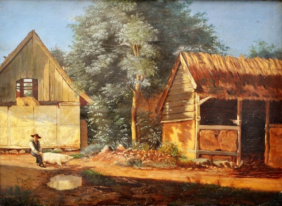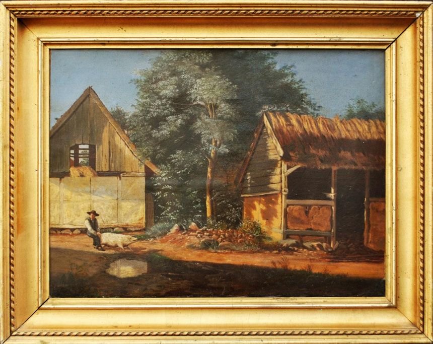 Bøgh, Carl (1827 - 1893) Danmark: En dreng, holder en gris i halen ved en gammel bondegård. Olie på papir/lærred. 37 x 50 cm. Usigneret. På blændramme flere numre fra gamle auktioner.