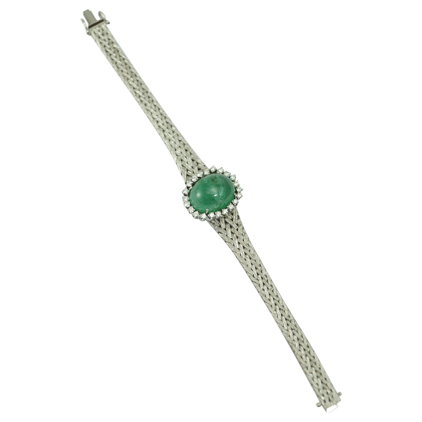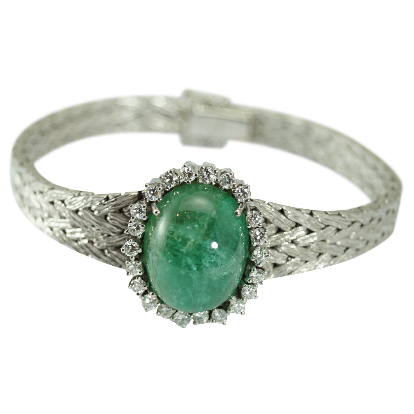 18 kt.Hvidgulds armbånd med 1 stor cabochon slebet smaragd( ca 20,00ct, ) og med 22 brillanter.