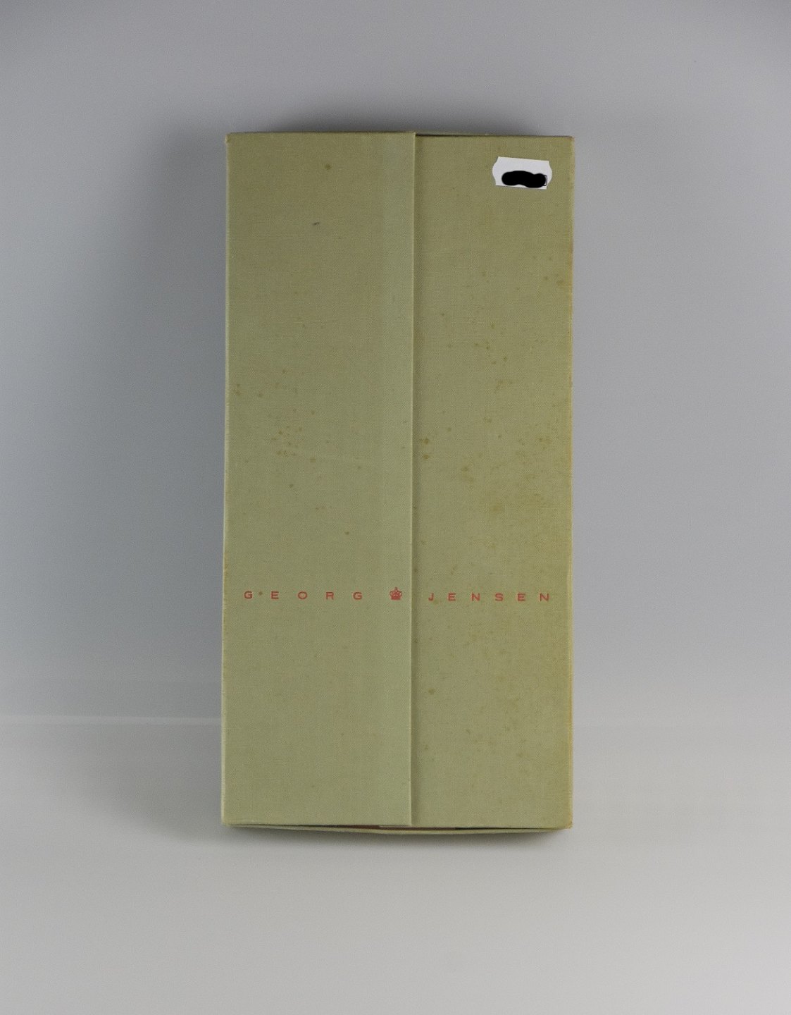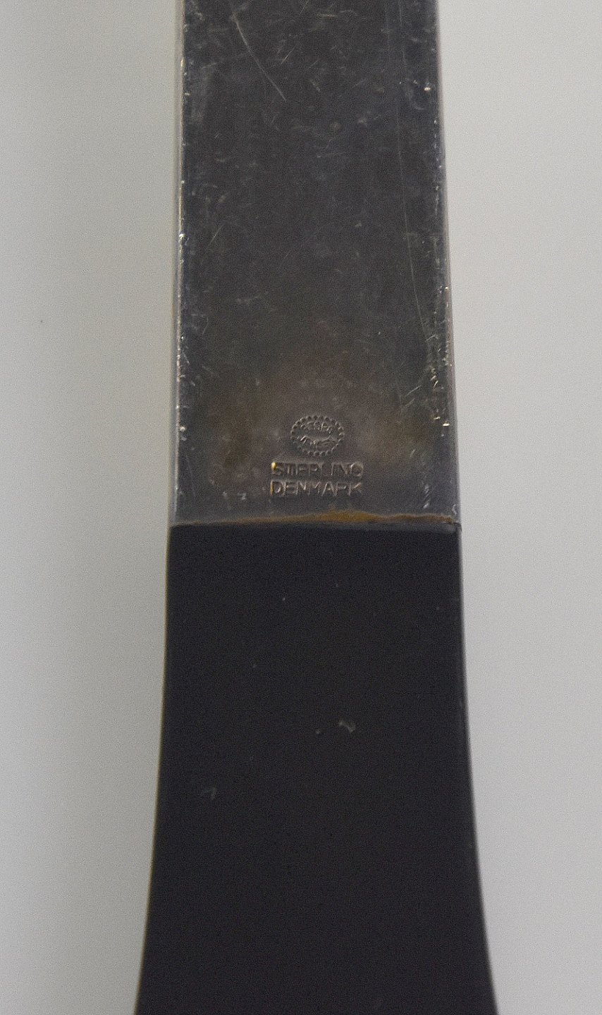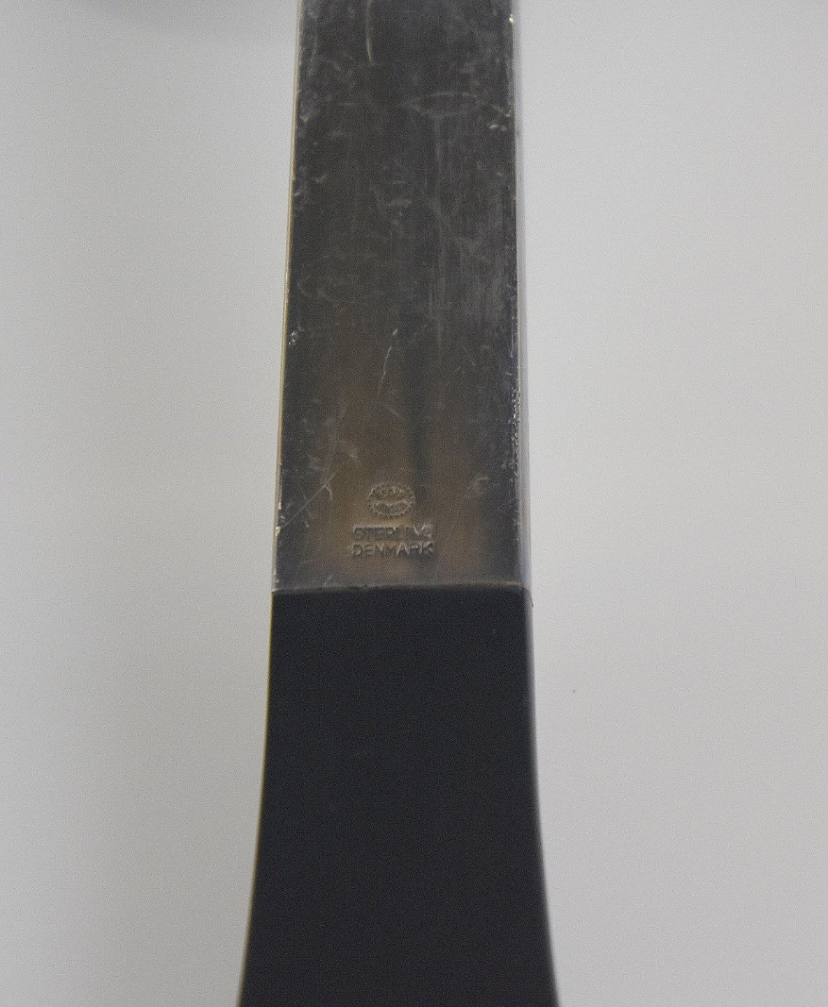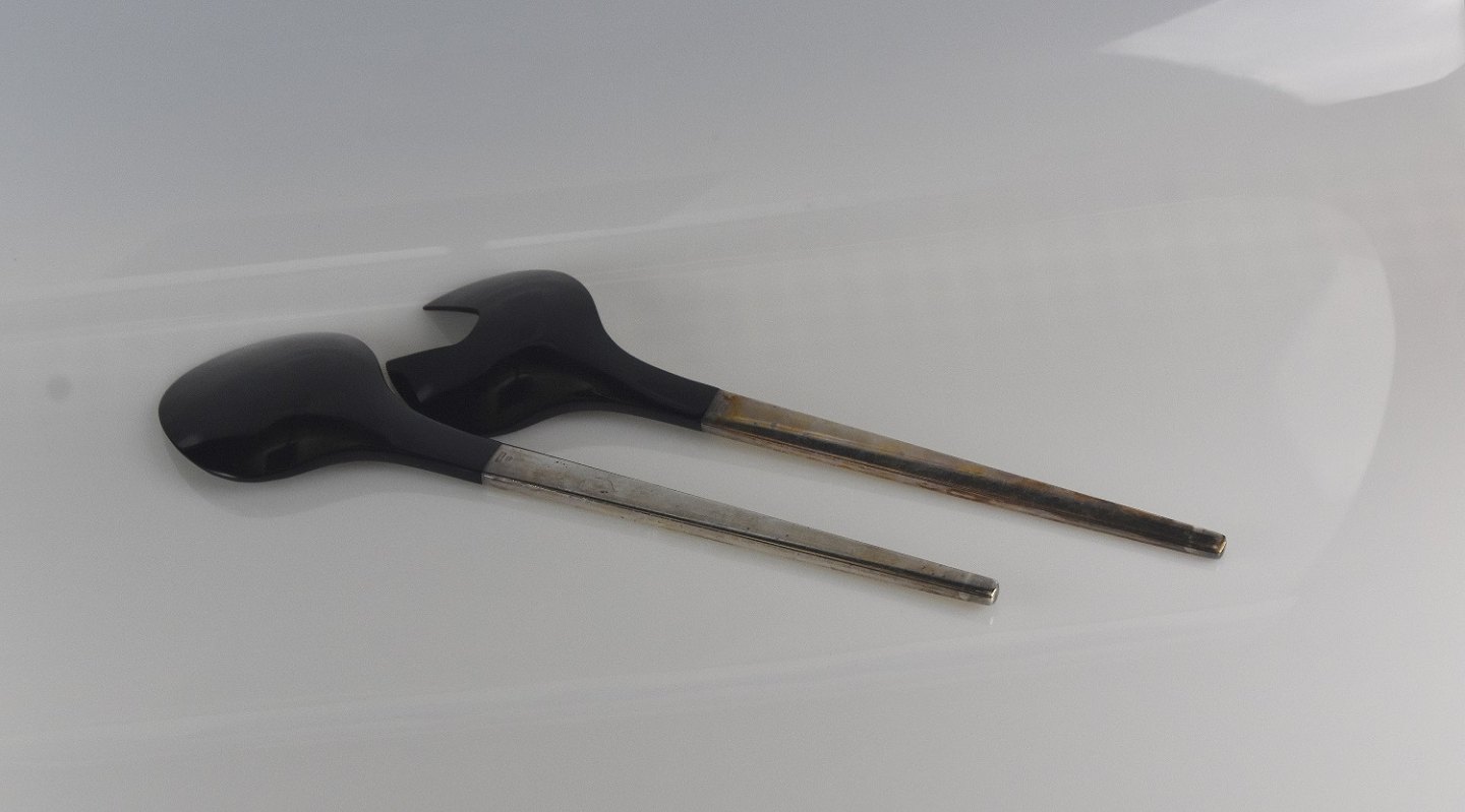 Text available in Danish: Caravel salatbestik af sterling sølv og sort melamin. Design Henning Koppel, produceret af Georg Jensen. Formgivet 1958. Kommer i original æske. Bestikket har små brugsspor