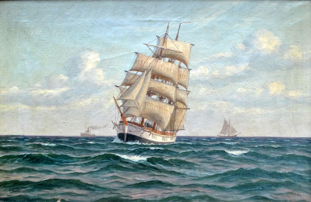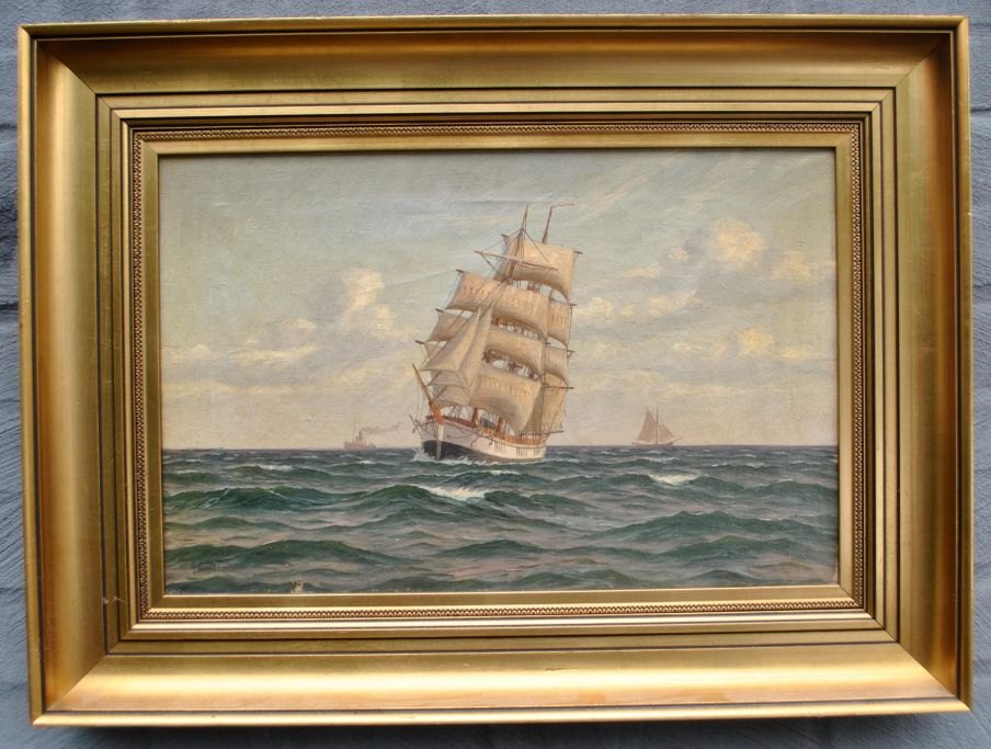 Bülow, A. (19./20. årh.): Marine. Olie på lærred. Signeret: A. Bülow. 32 x 49 cm.