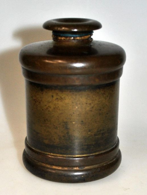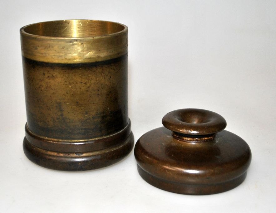 Messing cylinder med låg - antagelig garn nøgle, 20. årh. Danmark. Patineret. Højde.: 10,8 cm.