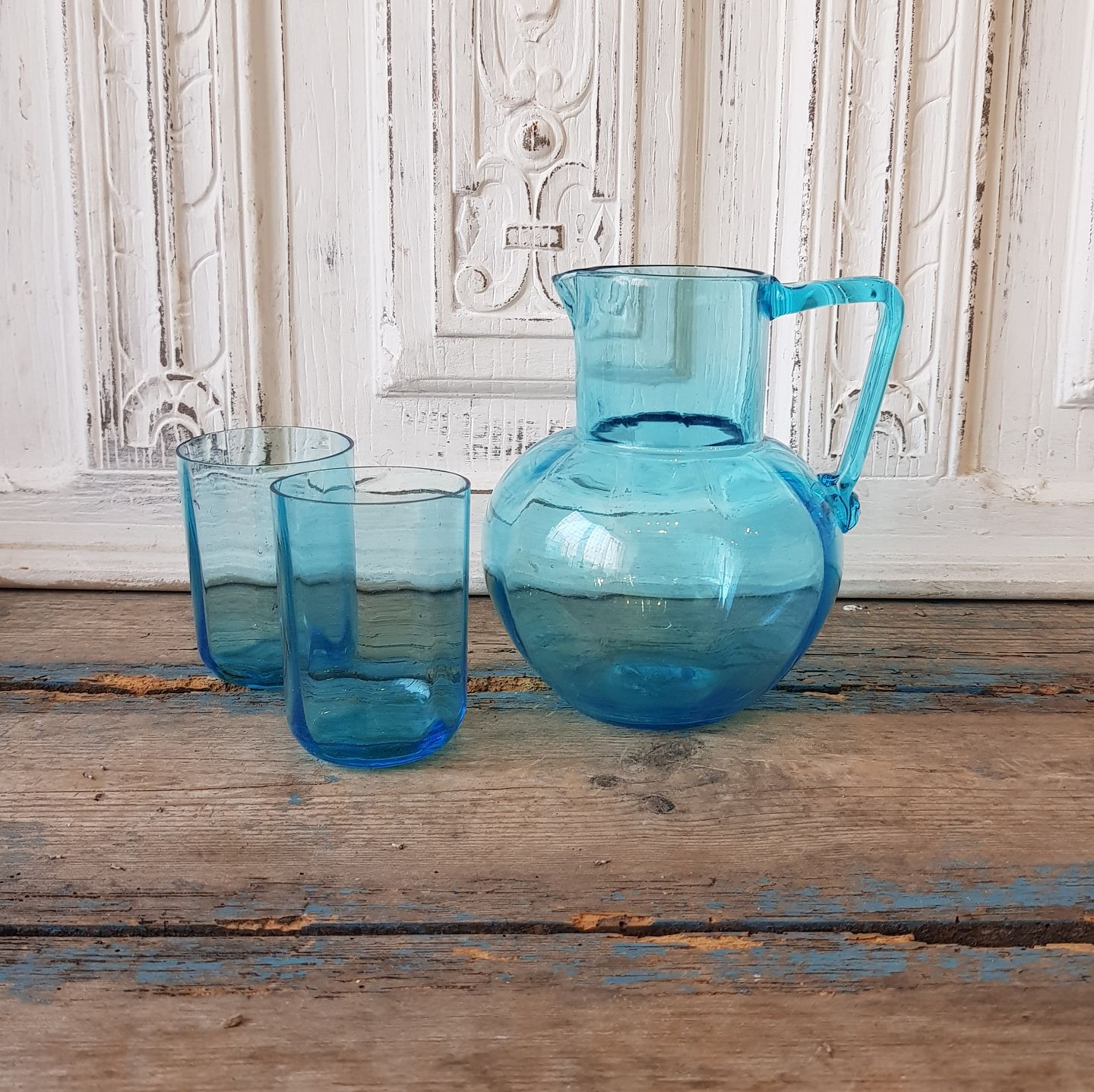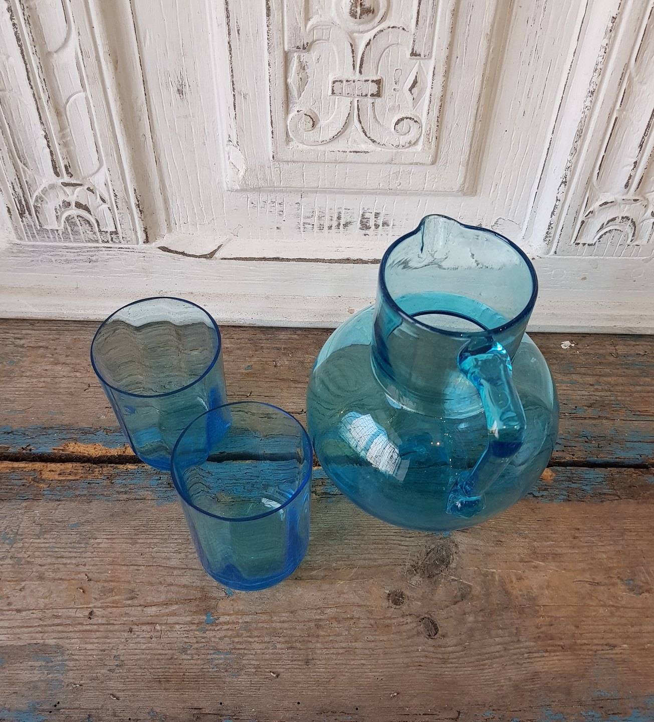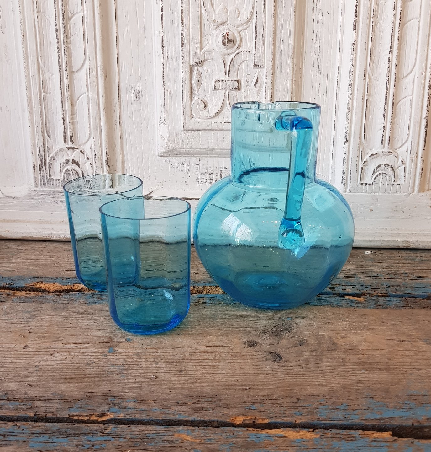 Søblå vandkande med 2 vandglas.