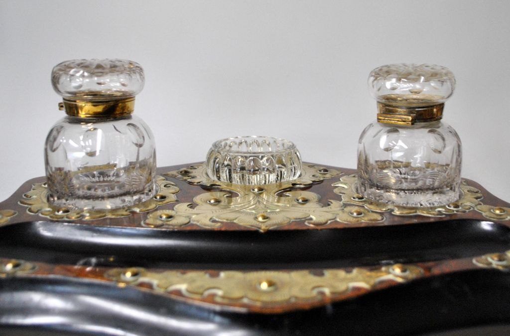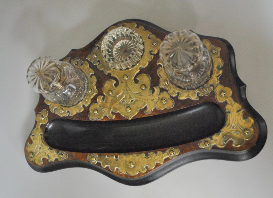 Engelsk skrivesæt, 19. årh. I poleret valnød med messing dekorationer. Med tre glas. På fødder. 36 x 26 cm. Under bund, label fra W. Whiteley, Bayswater, London.
