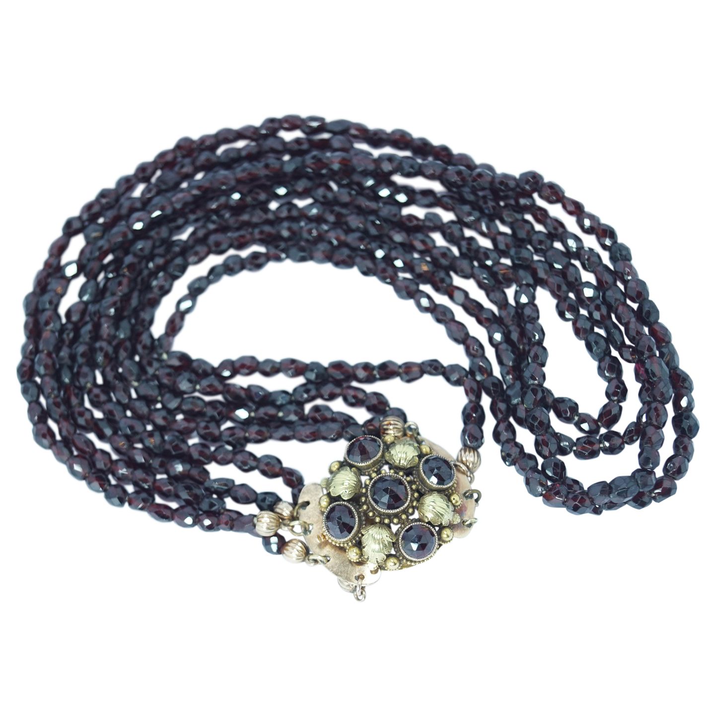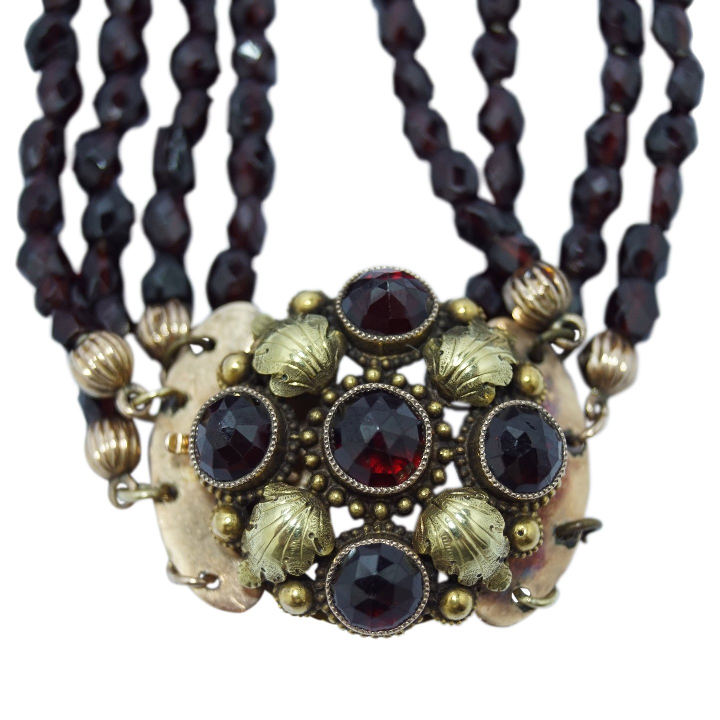 Halskæde med granater, prydet med lås af 14 kt. guld og granater.