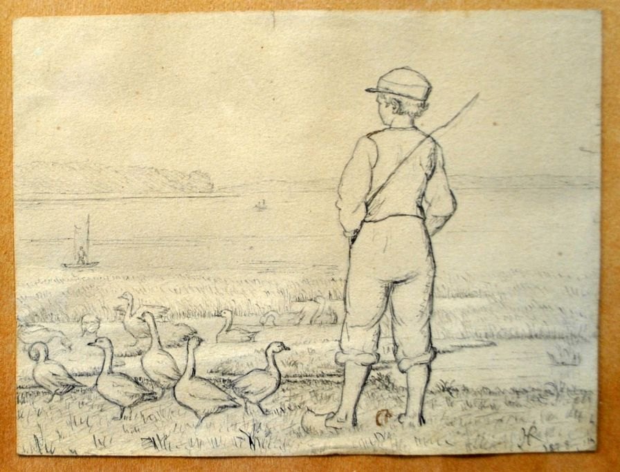 Dansk kunstner (19. årh.): En dreng paser gæs. Bly/tusch på papir. Signeret: Monogram 1878. 11,5 x 15 cm.