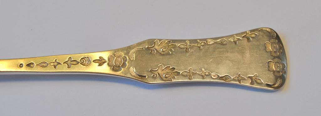 Sølv ske, Hans Christian Frendesen (1817 - 1891)  Løgumkloster, Danmark. Stemplet med mester - og bymærke. Med blomster dekoration. Med inskrift.: K. L. Christiansen - J. M. Christiansen Banderup 1861. Længde.: 23 cm.