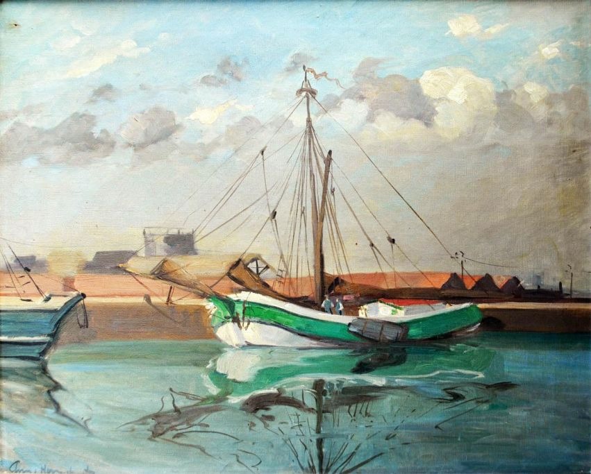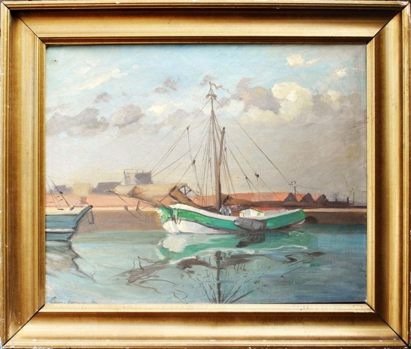 Handest, Aage (1894 - 1965) Danmark. Skib i havn.