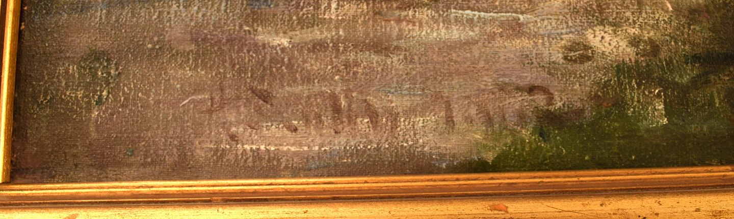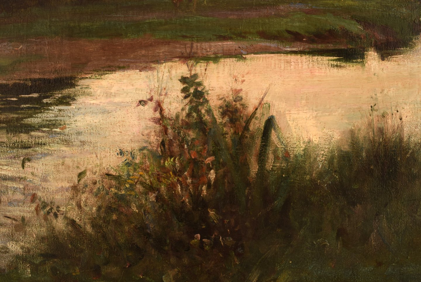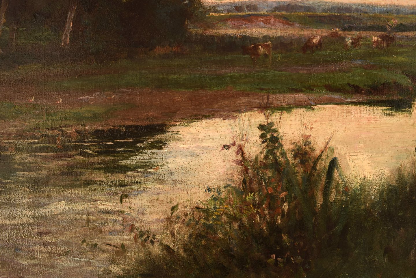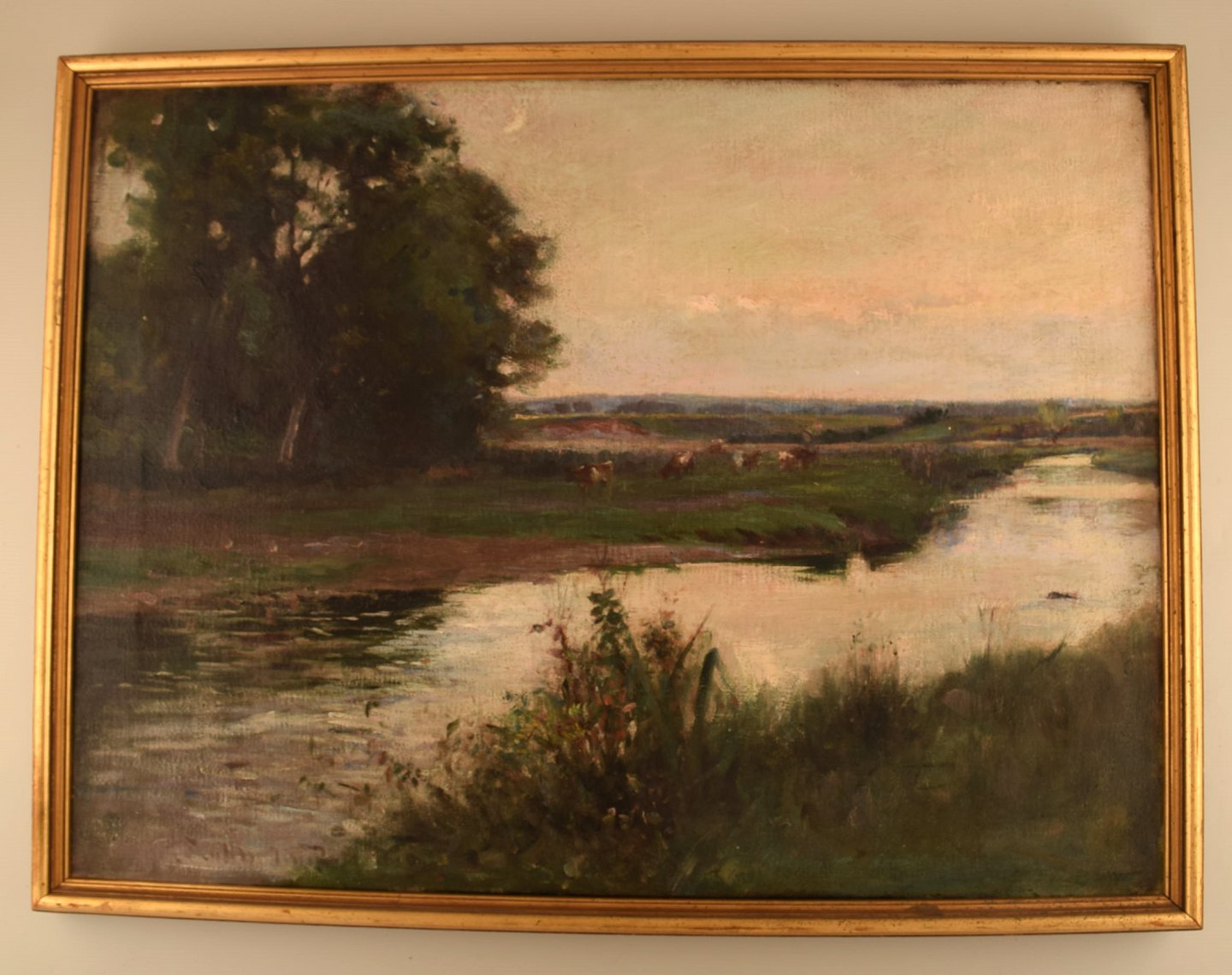 Joseph Milne, 1861-1911. English artist. English landscape with grazing cows. Title: "Pasture". Impressionist style. High quality painting, about 1900.