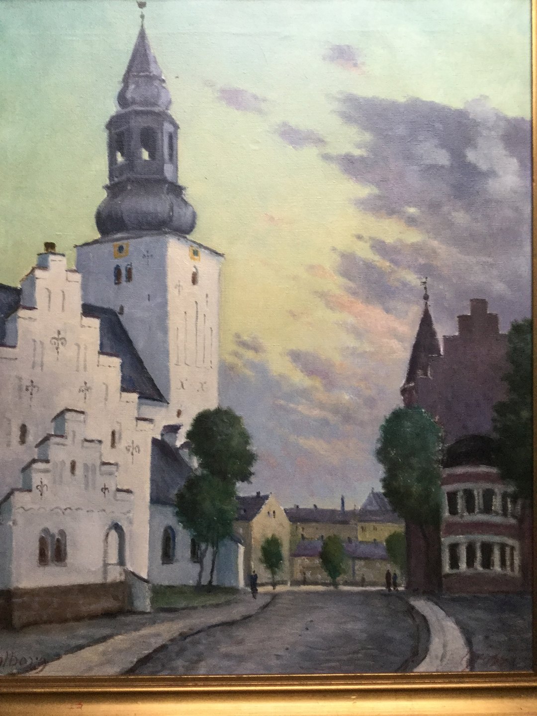 Text available in Danish: Maleri - Einar Gross - Parti fra Gammel Torv i Aalborg med Budolfi Kirke og Posthuset.