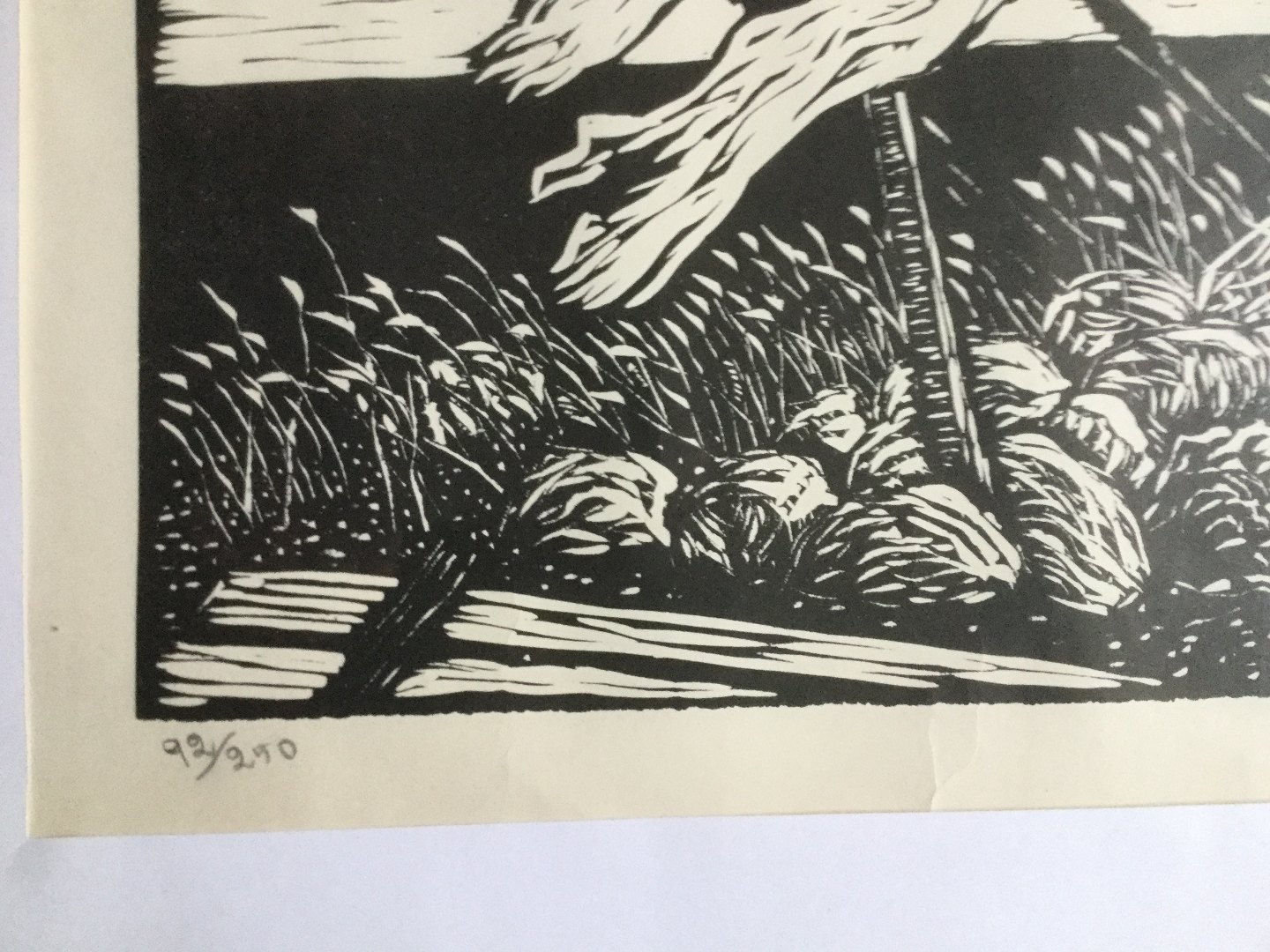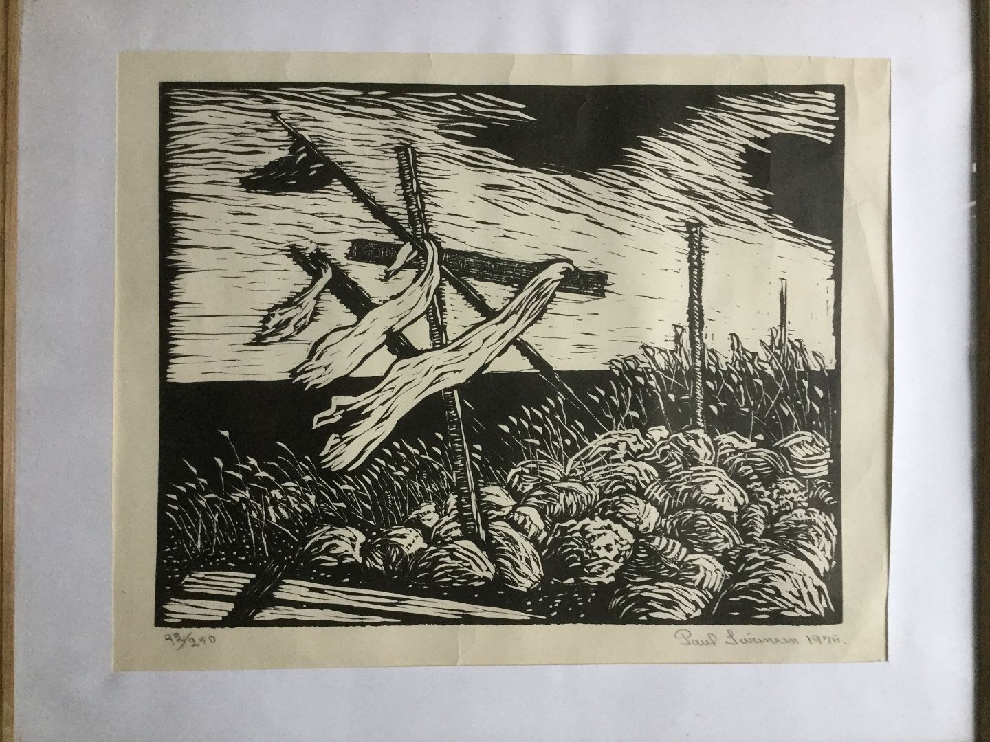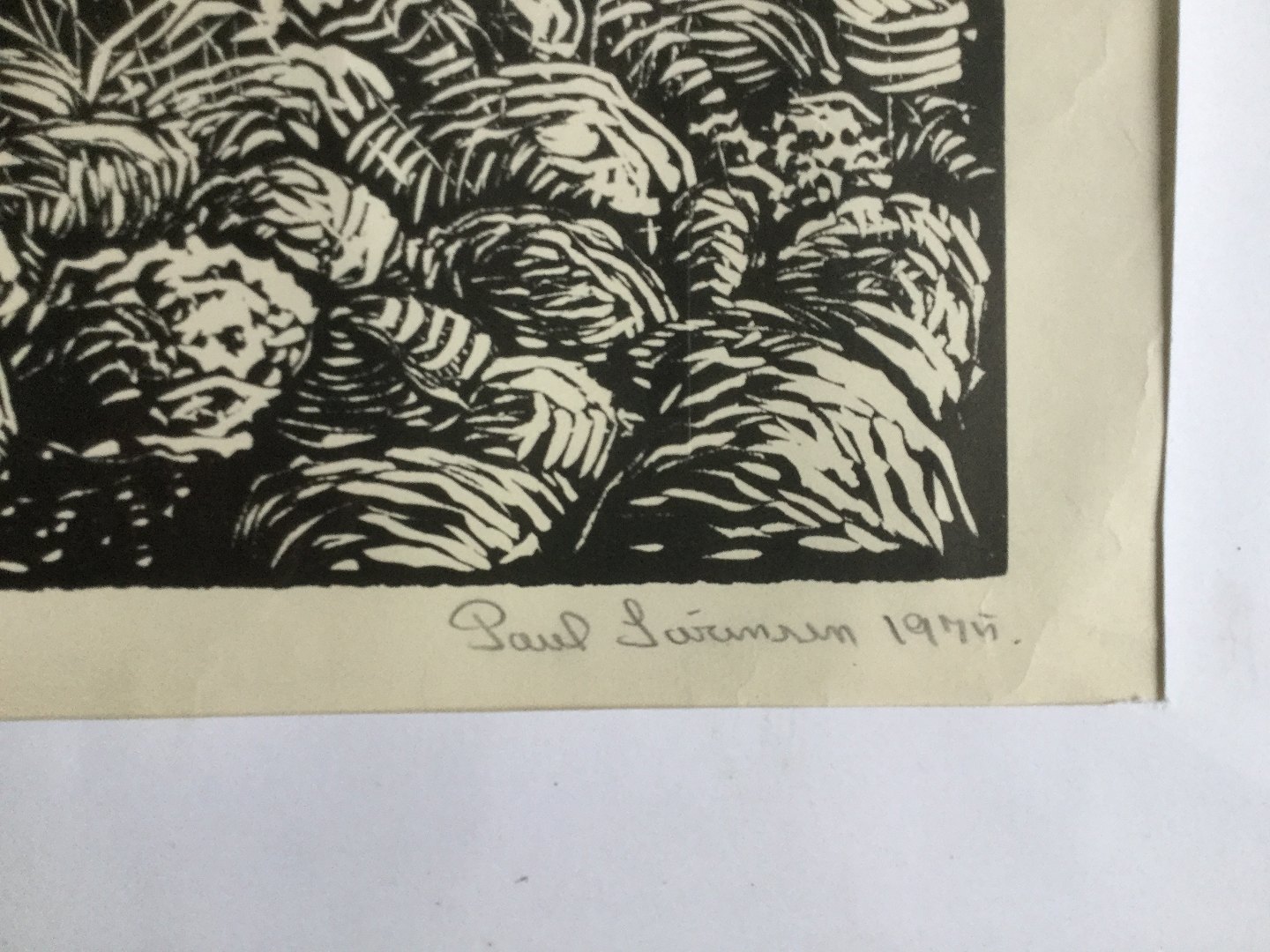 Text available in Danish: Træsnit af Poul Sørensen - Kystparti med fiskegrej efter storm 1975.
