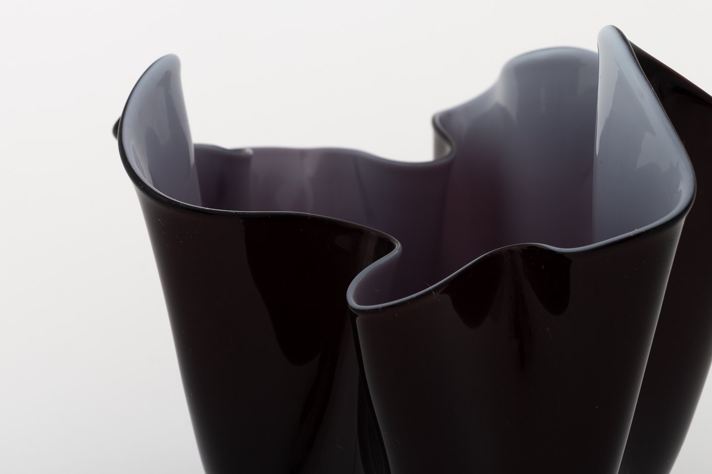 Fazzoletto vase i mørkelilla glas fra 1950'erne. Model: Handkerchief.
