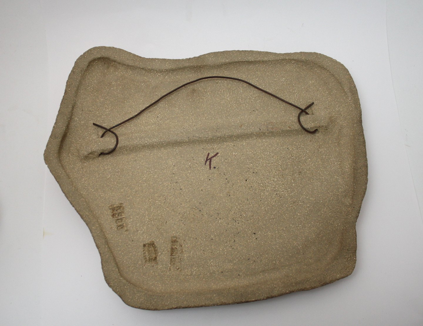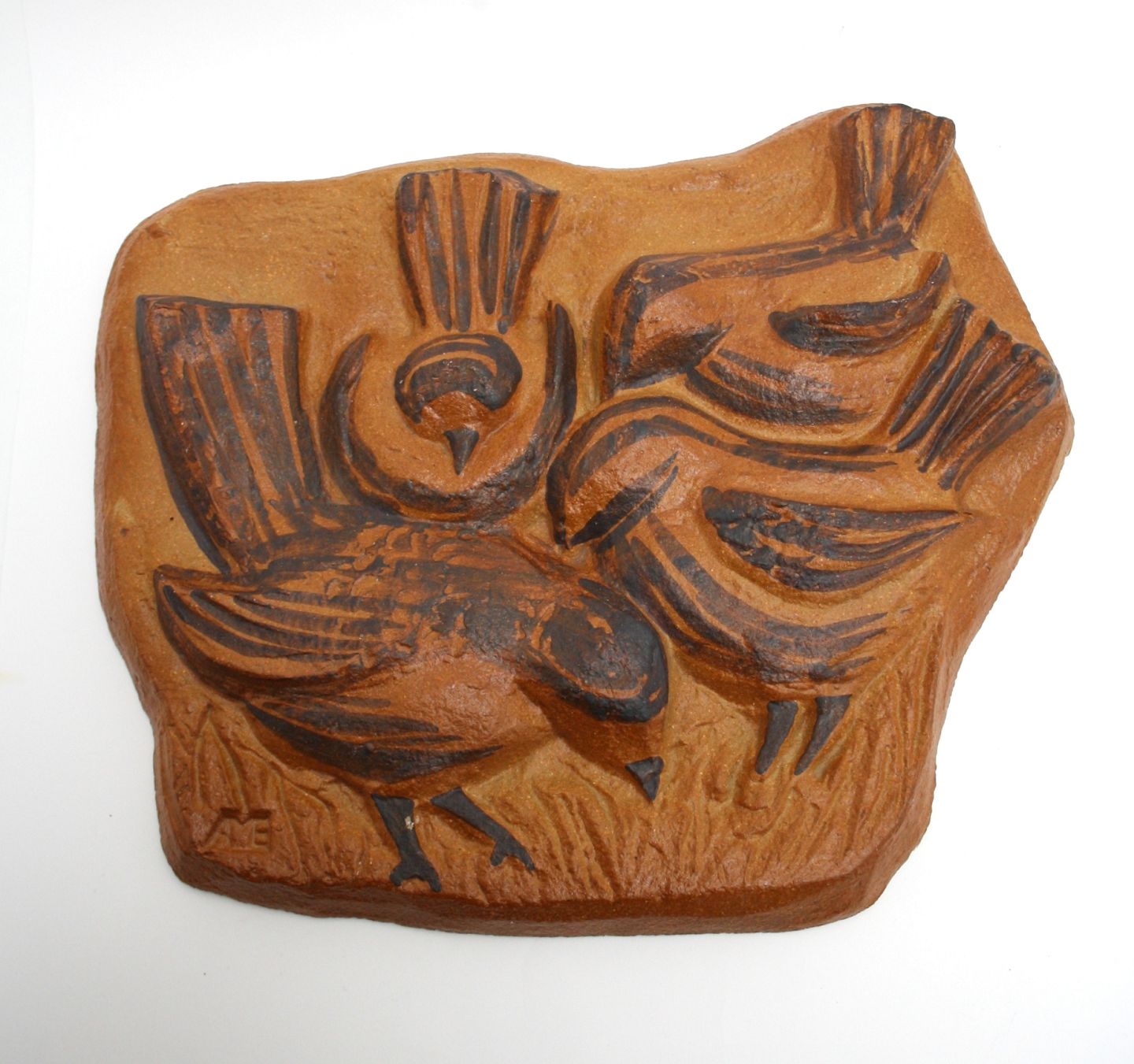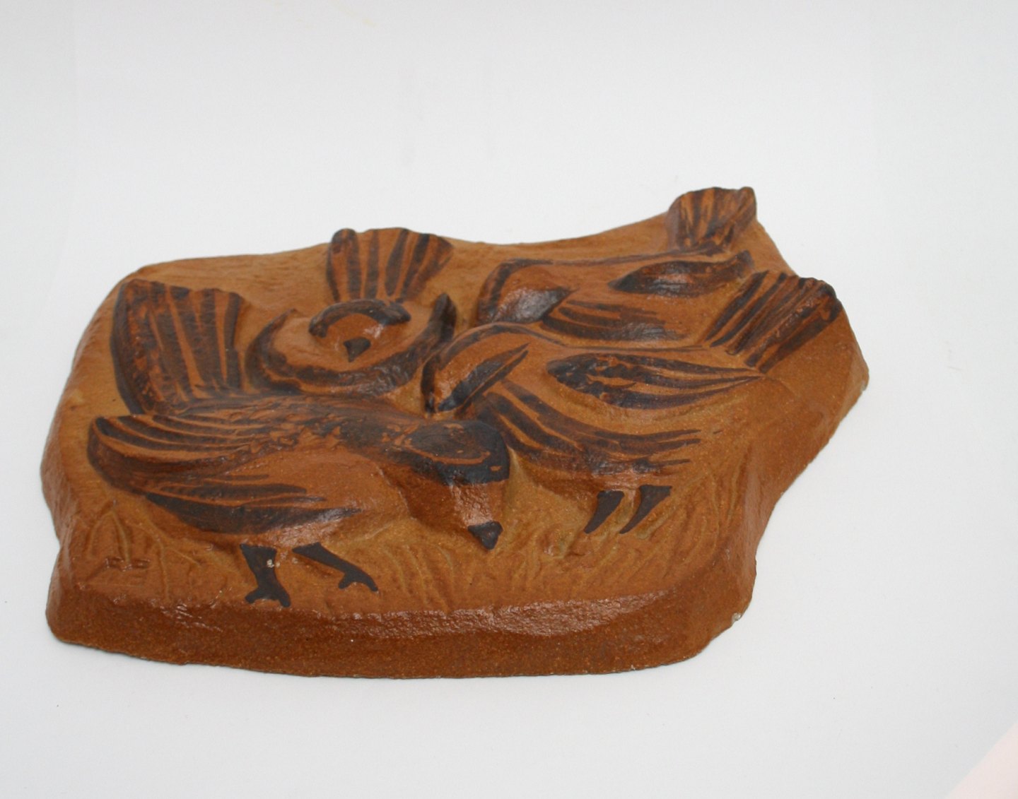 Søholm, Stort matglaseret relief med fugle. Formnr. 3360. Stemplet 17 juni 1960. 33 x 31 cm. Afslag på nederste fugls ben. 2 kanthak på bagside. Pris: 425 kr.