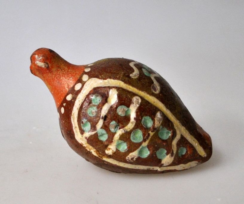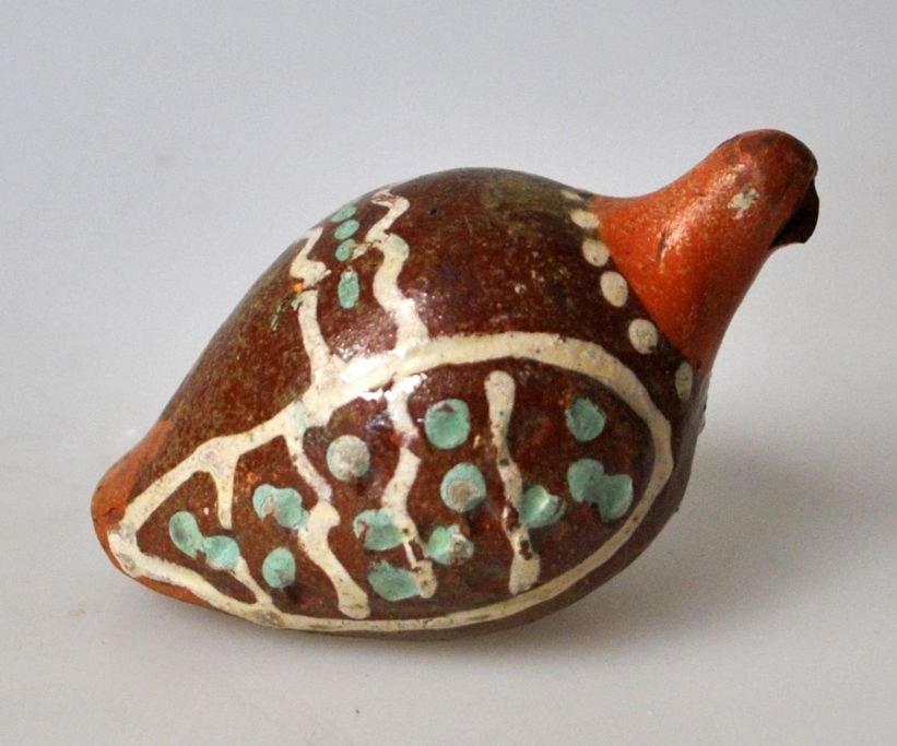Fugle fløjte, 19. årh. Danmark. Rødler med overglasurer i brunt, grønt og hvidt. L.: 10 cm. H.: 6 cm.