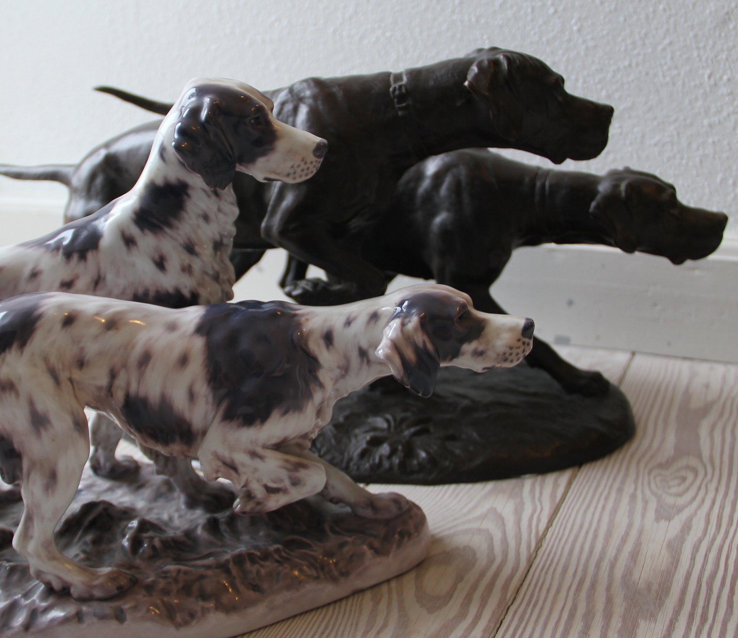 Lauritz Jensen gjorde sig tidligt bemærket som dyreskulptør. I 1894 skaber han statuen ”To jagthunde, der står for hønsene (Statens Museum for Kunst), som i 1900 får en sølvmedalje ved Verdensudstillingen i Paris. I 1896 er dette motiv at finde i Ipsens katalog som nr. 704, højde 20 cm, dateret 1889. På bestilling skabtes samme med en længde på 125 cm fra snude til halespids. Inden 1920 blev den også fremstillet i bronze. Efter Lauritz Jensens død køber hans gode ven og kollega fra Bing og Grøndahl Jens Peter Dahl Jensen (1874-1960) hele hans modelsamling. Hundegruppen fik nu nyt liv som Dahl Jensen figur nr. 1278 To Engelske settere 40 cm og er verden over kendt som en af de fornemste danske porcelænshundefigurer,