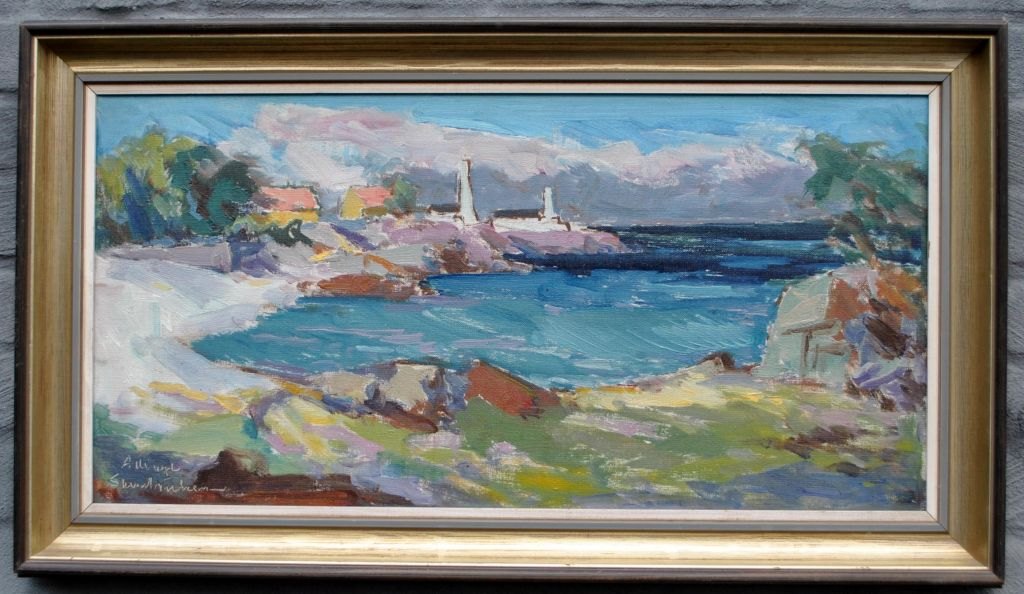 Nielsen, Svend (1908 - 1993) Denmark: Scene from Allinge. Oil on canvas. Signed. 32 x 64 m