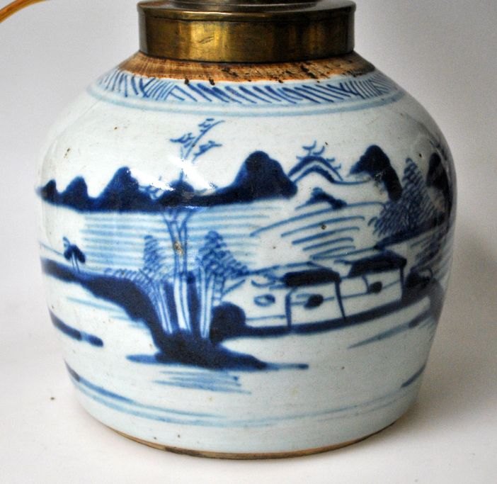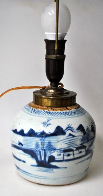Blå/hvid bojan, 18./19. årh. Kina. Hånddekoreret med landskaber. Højde: 18 cm. Omformet til el lampe.