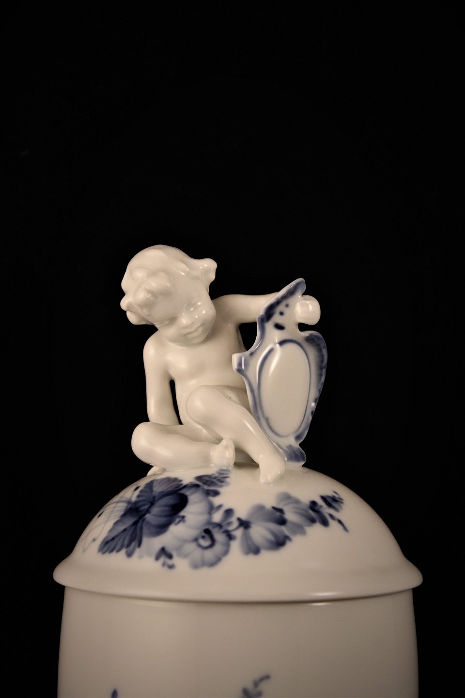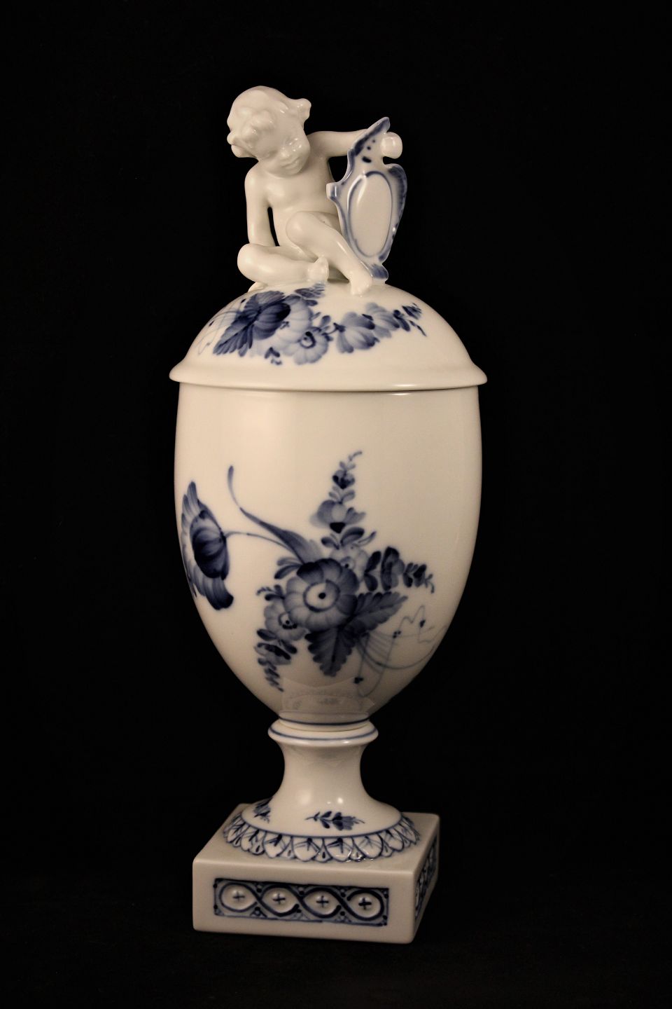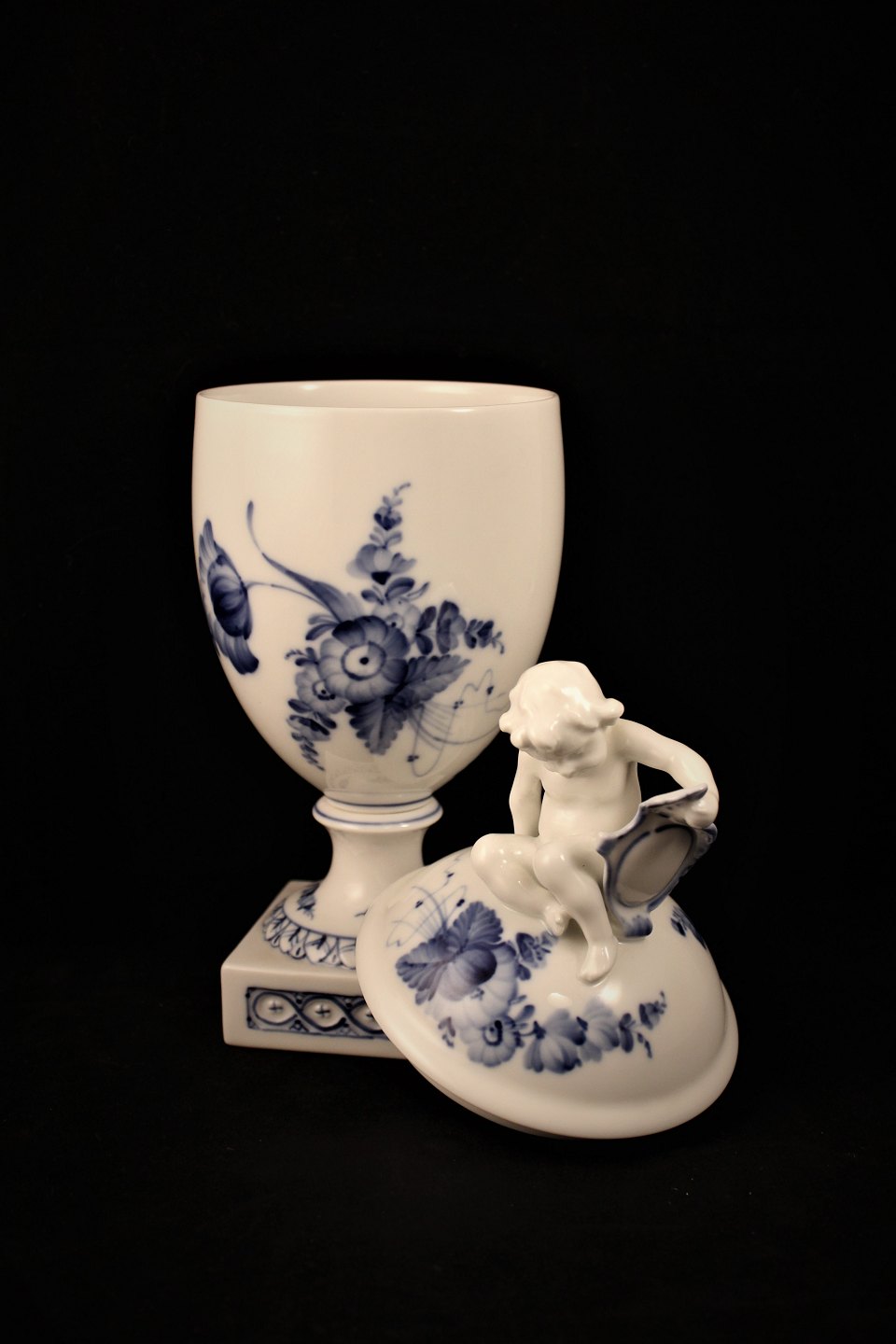 Blå Blomst æggevase / pokal vase fra Royal Copenhagen med lille dreng på låget.