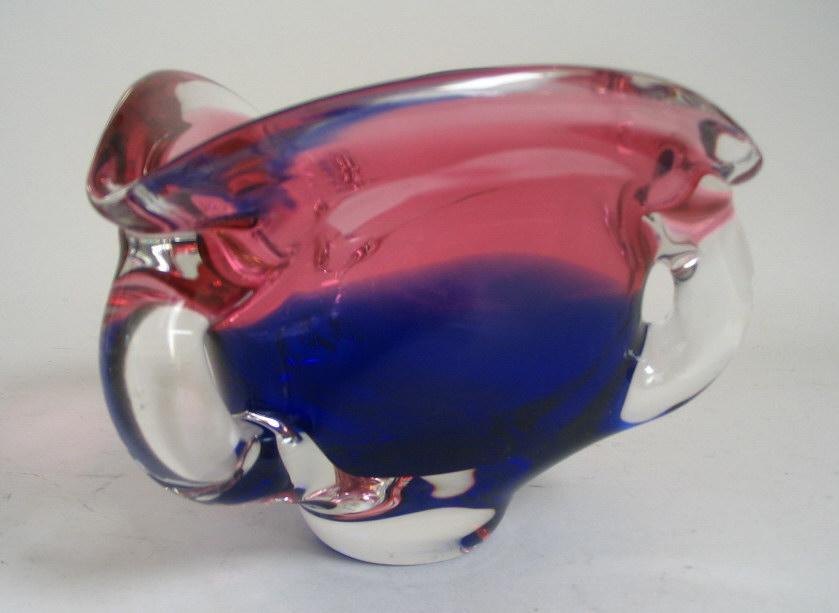 Flerfarvet glasskål, 1960'erne, Europa. I blåt og rosa. H.: 13 cm. B.: 17 cm.