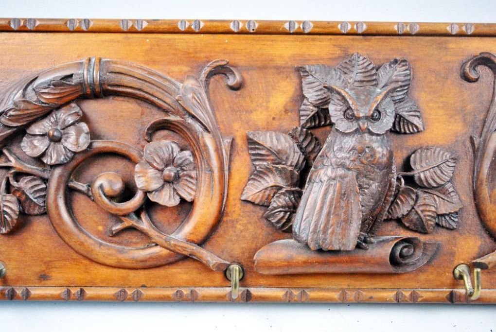 Klæde holder, 19. årh. Valnød. Med udskårne dekorationer i form af overflødighedshorn og ugle. L: 67 cm. H.: 13,5 cm. Virkelig flot stand! Udlånt til TV programmet Krejlerkongen, 2020.