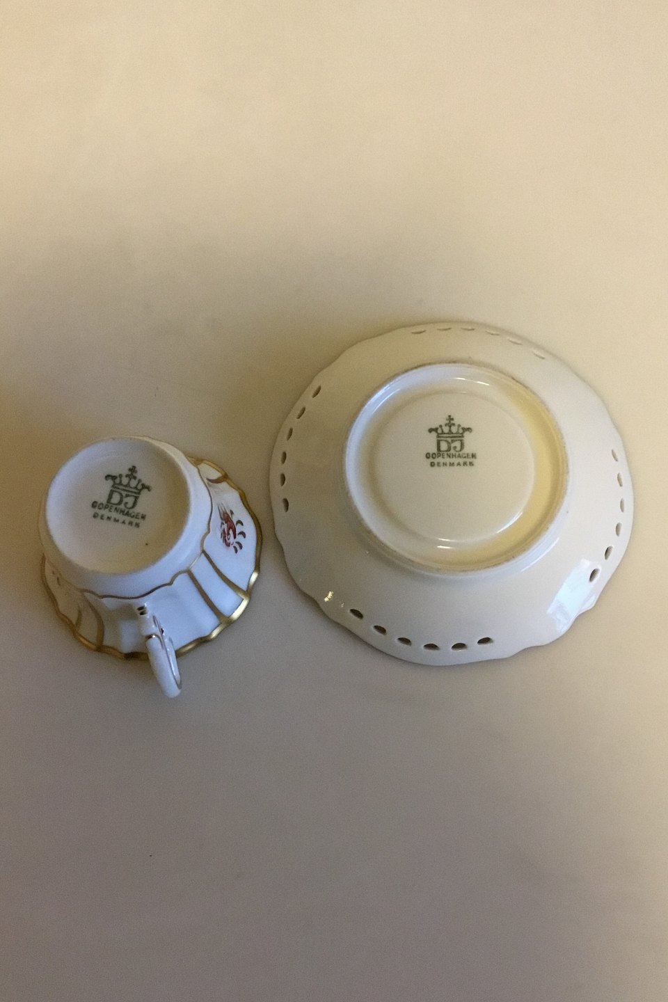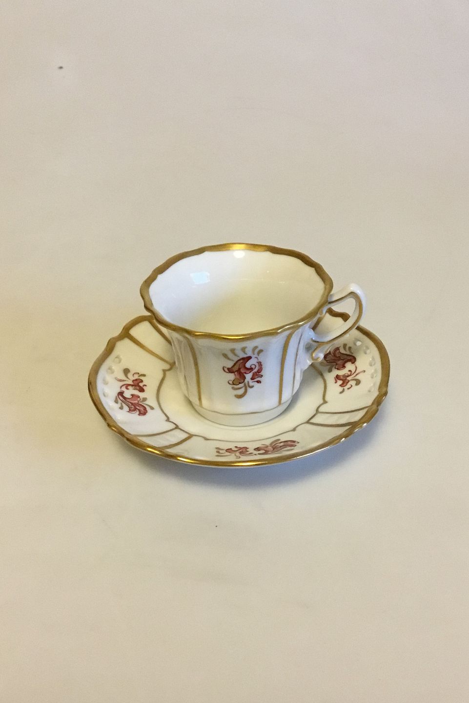 Dahl Jensen Dronning Mocca Cup and Saucer with Gold and Pierced Border. Measures Cup: 7 cm / 2 3/4 in. Saucer 12 cm / 4 23/32 in.