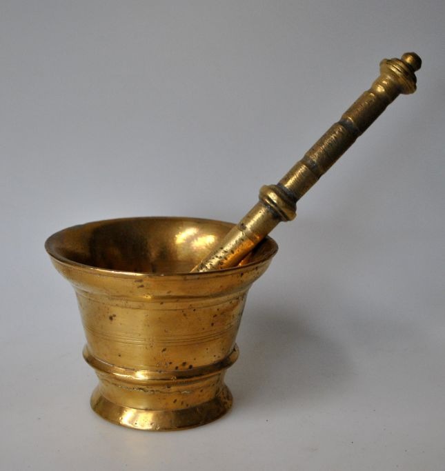 Messing morter med pistil, 17./18. årh. Danmark. Højde.: 9 cm. Længde pistil: 23 cm.