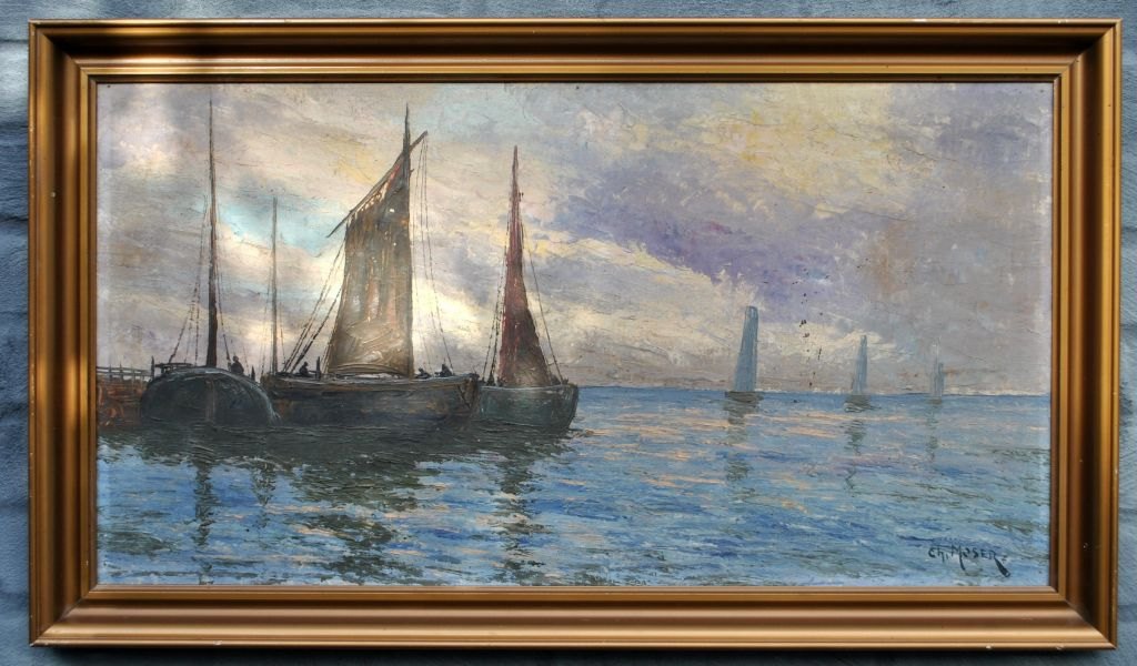 Moser, Christian (1838 - 1894) Holland: En havn. Olie på lærred. Signeret: Ch. Moser. 37 x 69 cm.