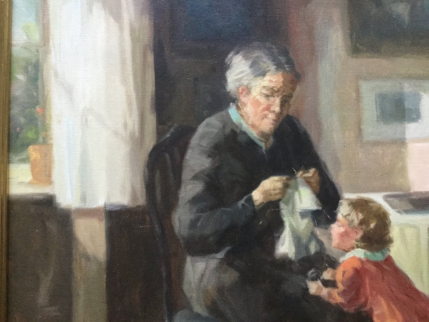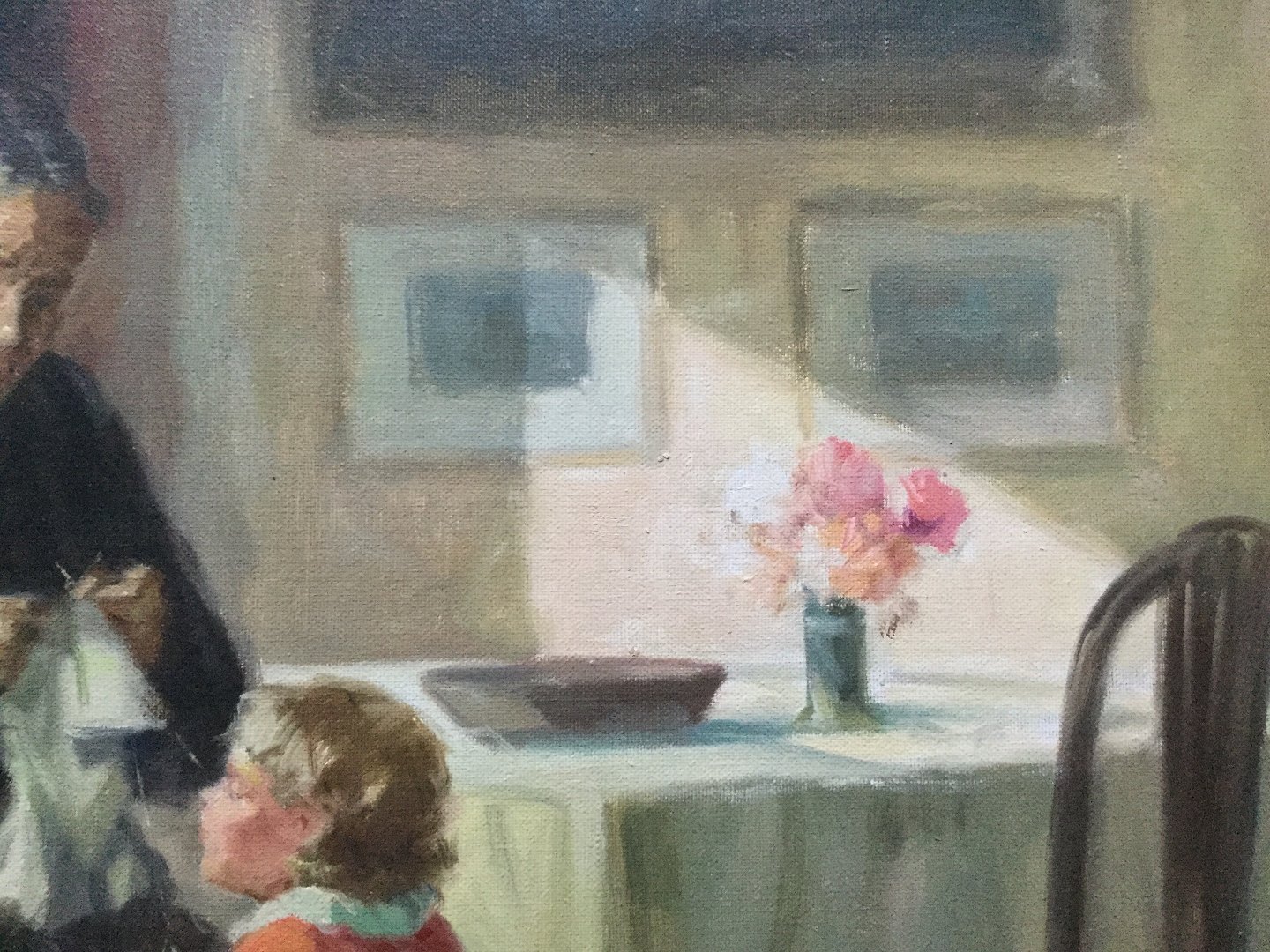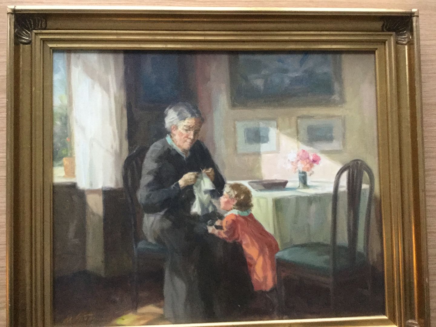 Maleri af Michael Stephánou - Interiør med strikkende kvinde og barn.