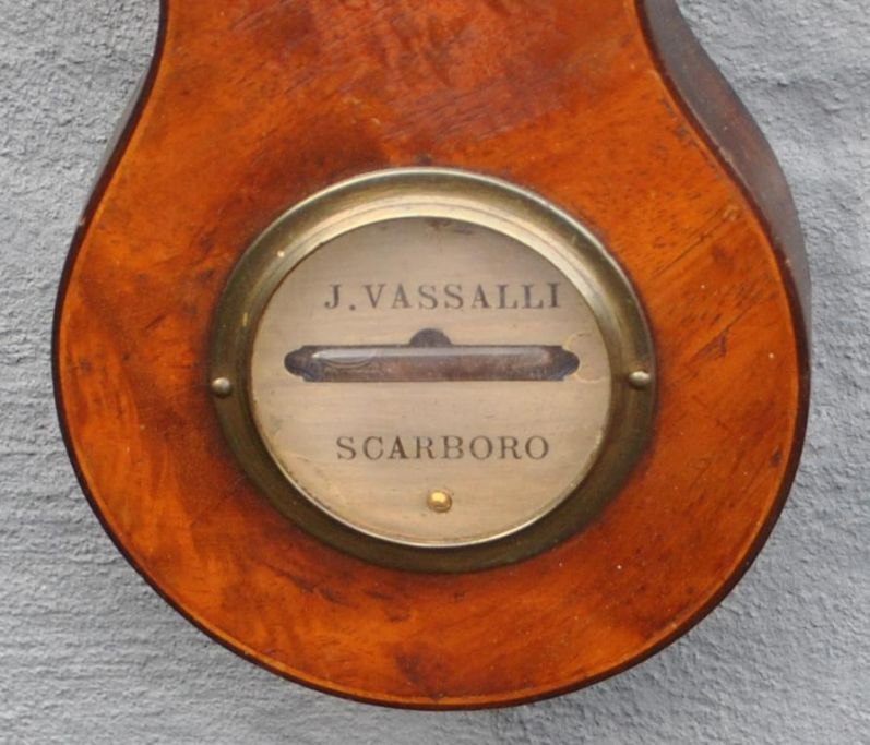 Engelsk hjul barometer, 19. årh. Mahogni kasse. Signeret: J. Vassalli, Scarboro.  Med alkohol termometer, hygrometer  m.v. H.: 99 cm.  Med småskader.