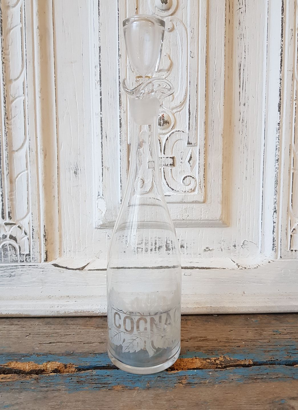 Holmegaard karaffel med matætset dekoration samt teksten Cognac.