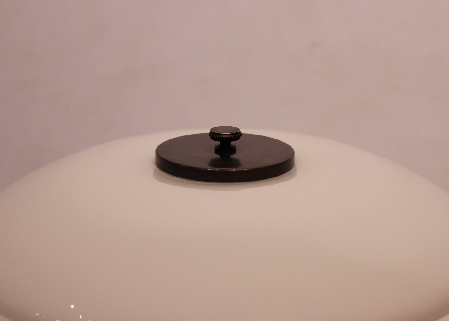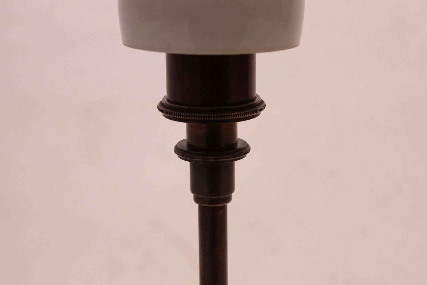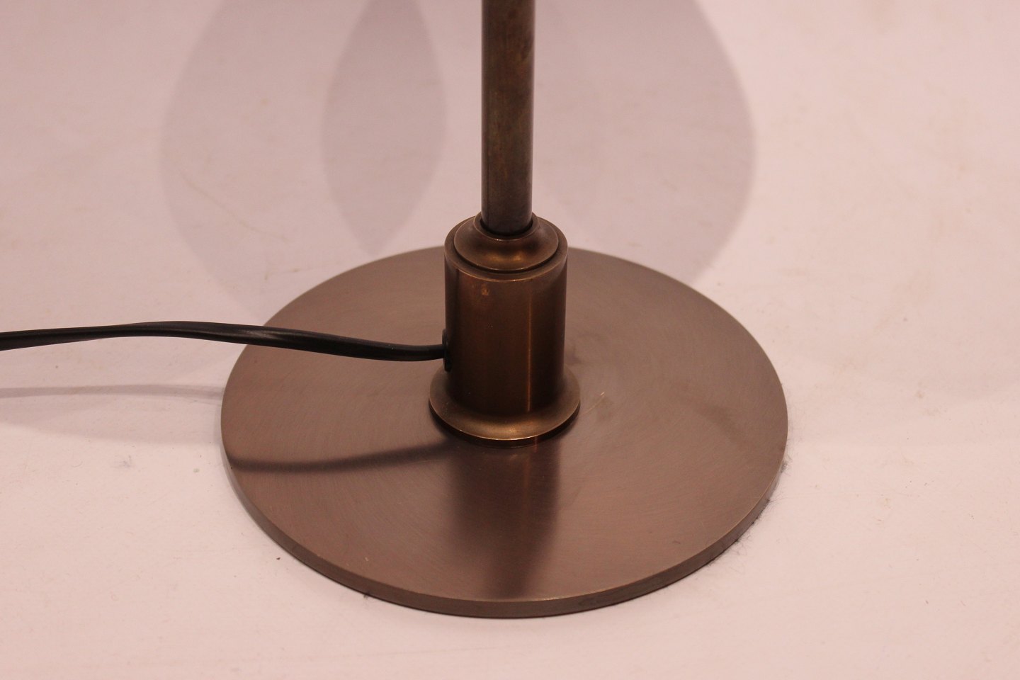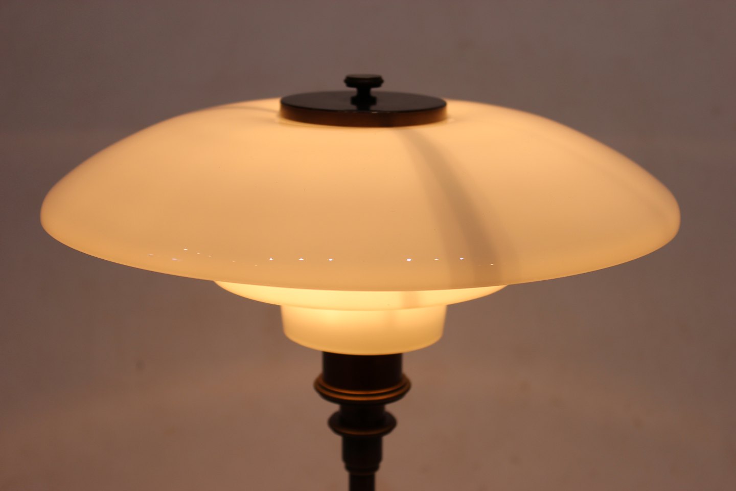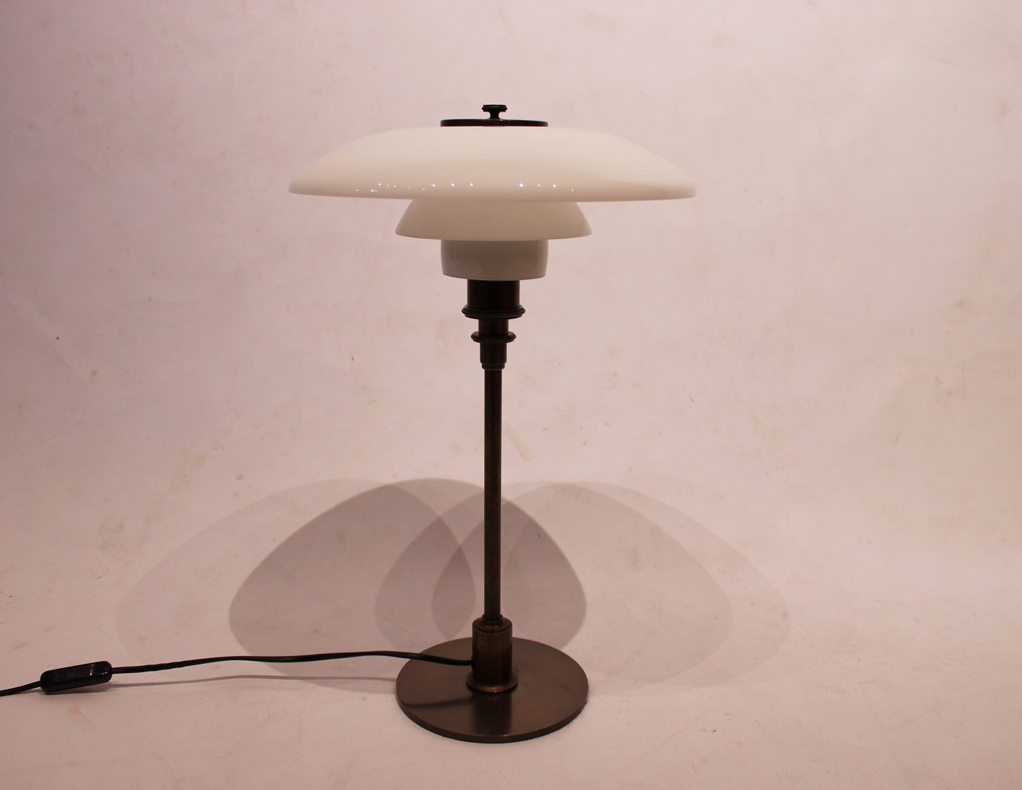 PH 3/2 bordlampe, model Treph, af hvid opal glas og stel af bruneret messing oprindeligt designet af Poul Henningsen og fremstillet af Louis Poulsen som jubilæumsmodel i anledning af Poul Henningsens 100 års fødselsdag i 1994.