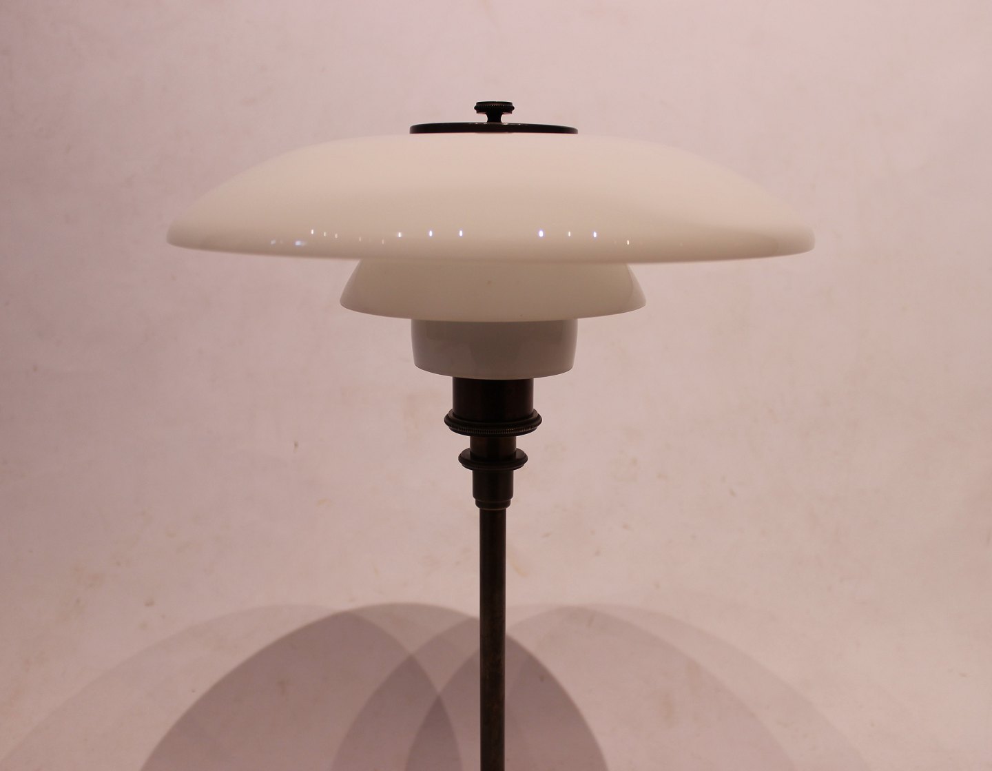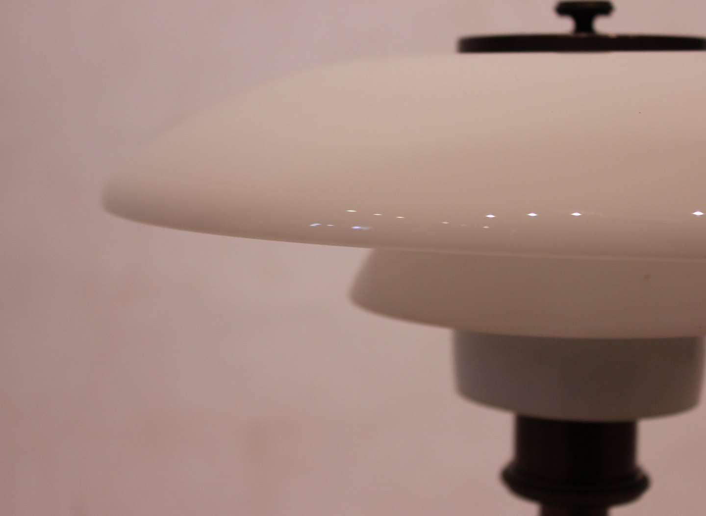 PH 3/2 bordlampe, model Treph, af hvid opal glas og stel af bruneret messing.
