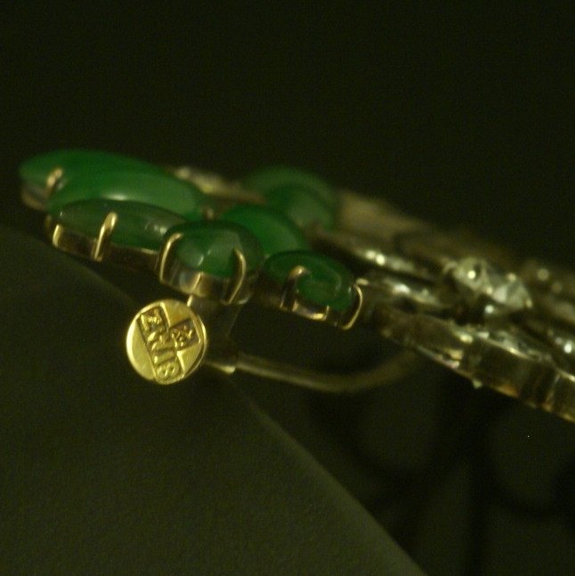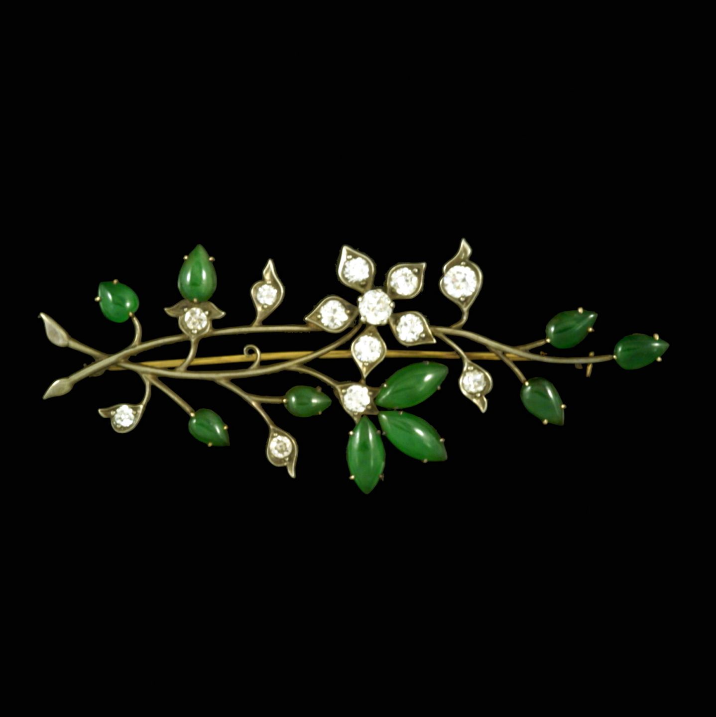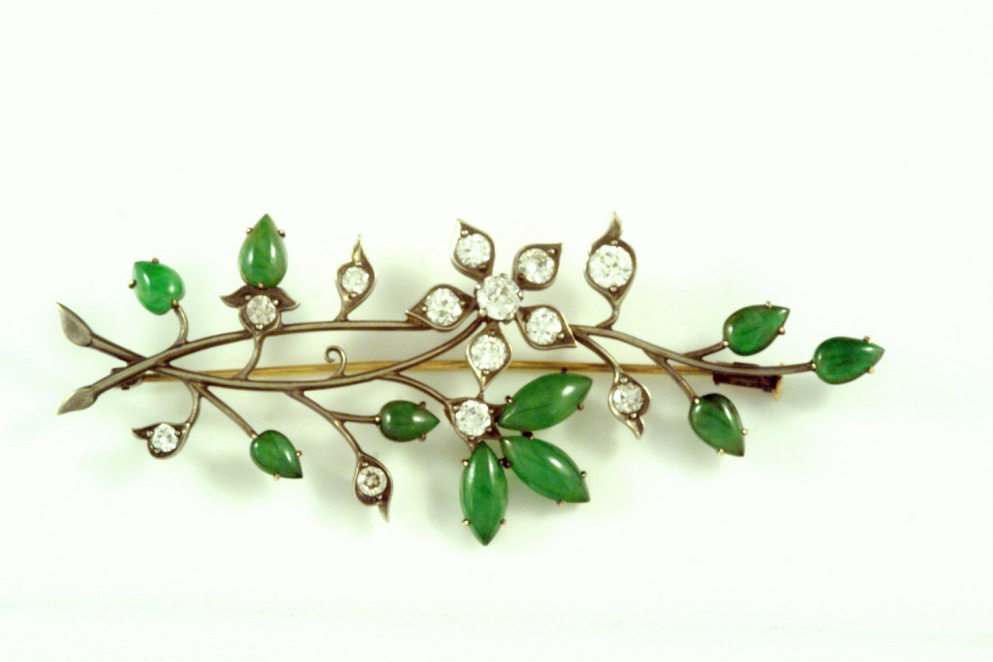 Vintage Broche i 18k guld og sølv med jade og diamanter. 1.40ct.