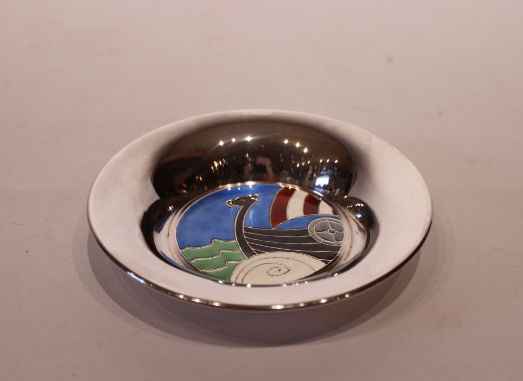 Small plate with enamel in different colors as a viking ship and of hallmarked silver.
