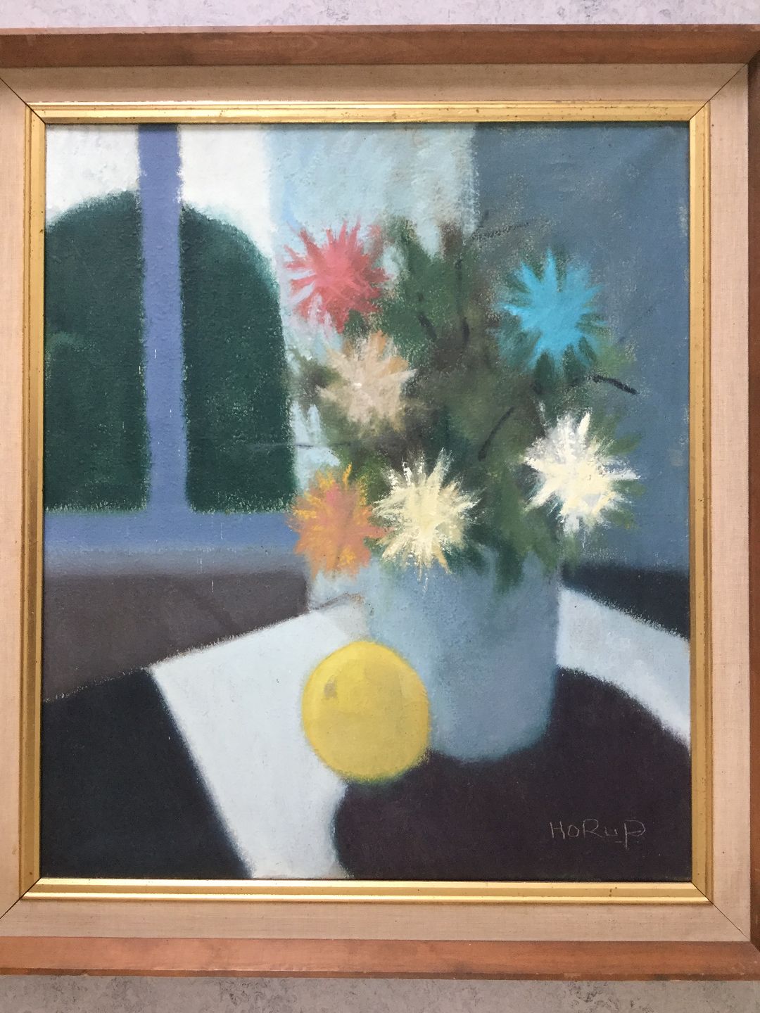 Maleri af Knud Horup - Opstilling ved vindue - vase med blomster og frugt.