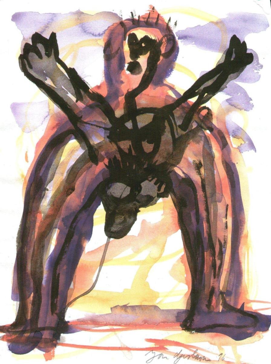 Gislason, Jon (1955-): Komposition med figur. Akvarel/tusch på papir. Sign.: Jon Gislason 96 (1996). 40 x 30 cm.