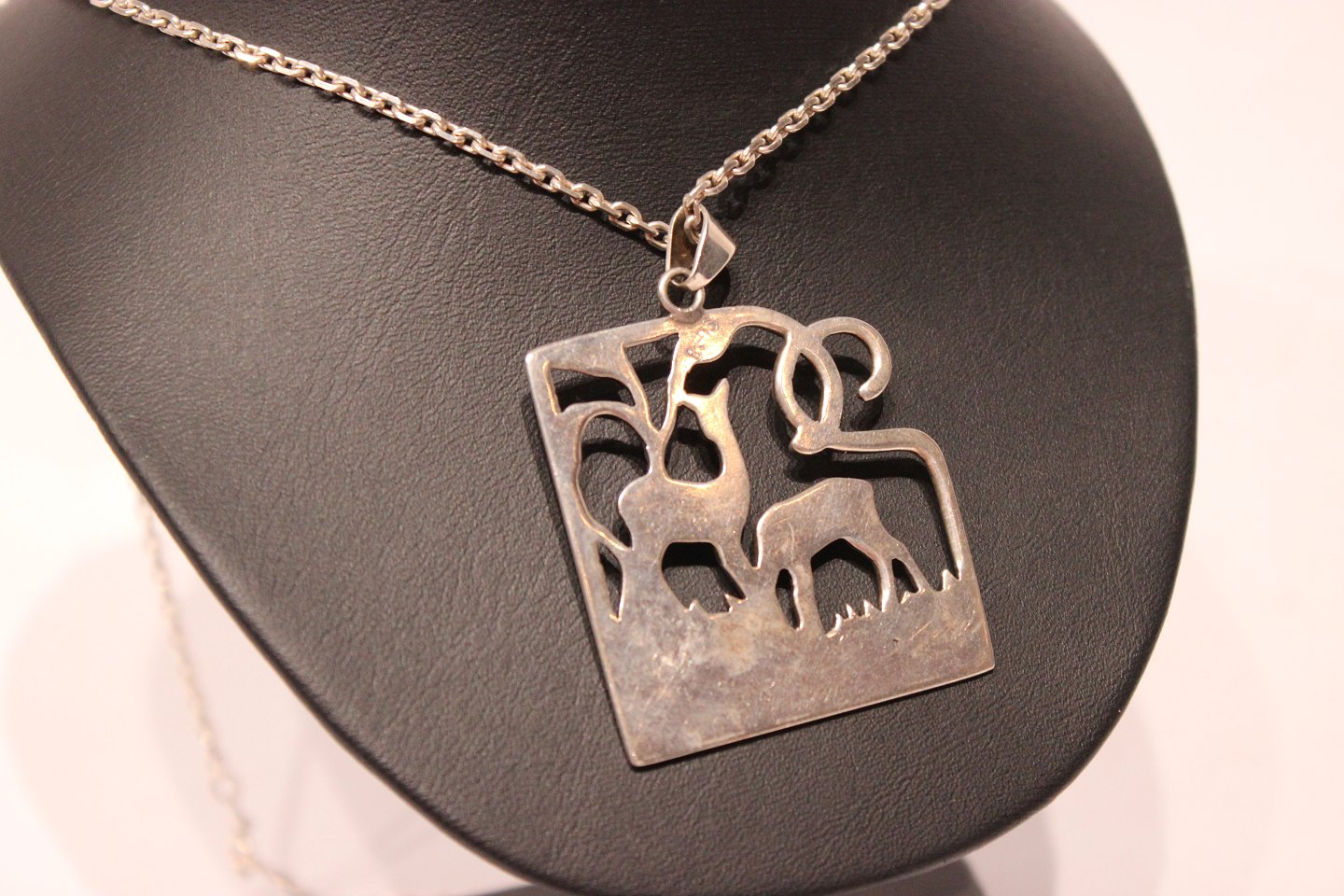 Sølvkæde med stort vedhæng med motiv af rådyr.