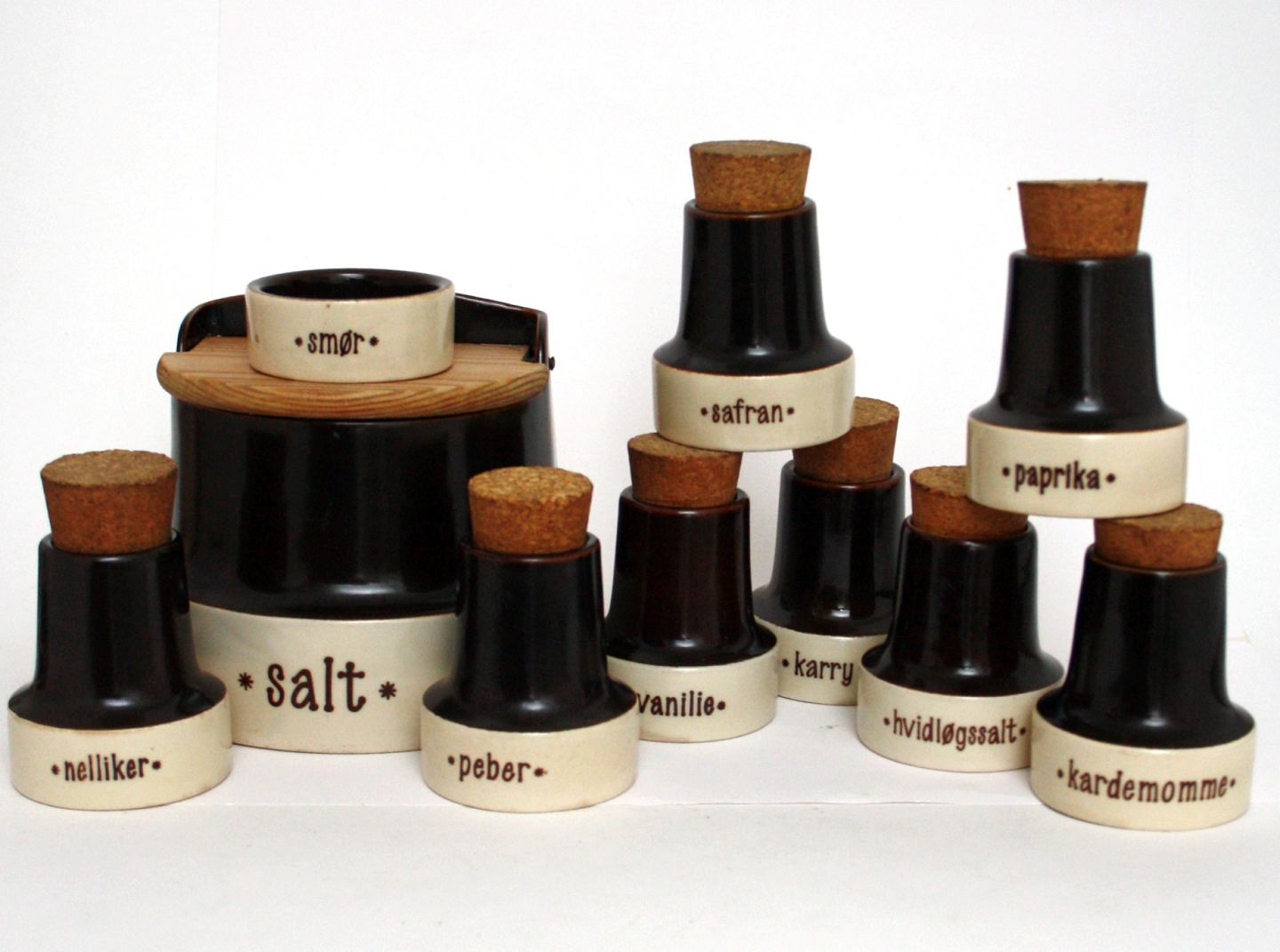 Text available in Danish: Søholm, Rikke, krydderikrukker. Højde uden korkprop 8 cm. Pris: 75 kr. stk.